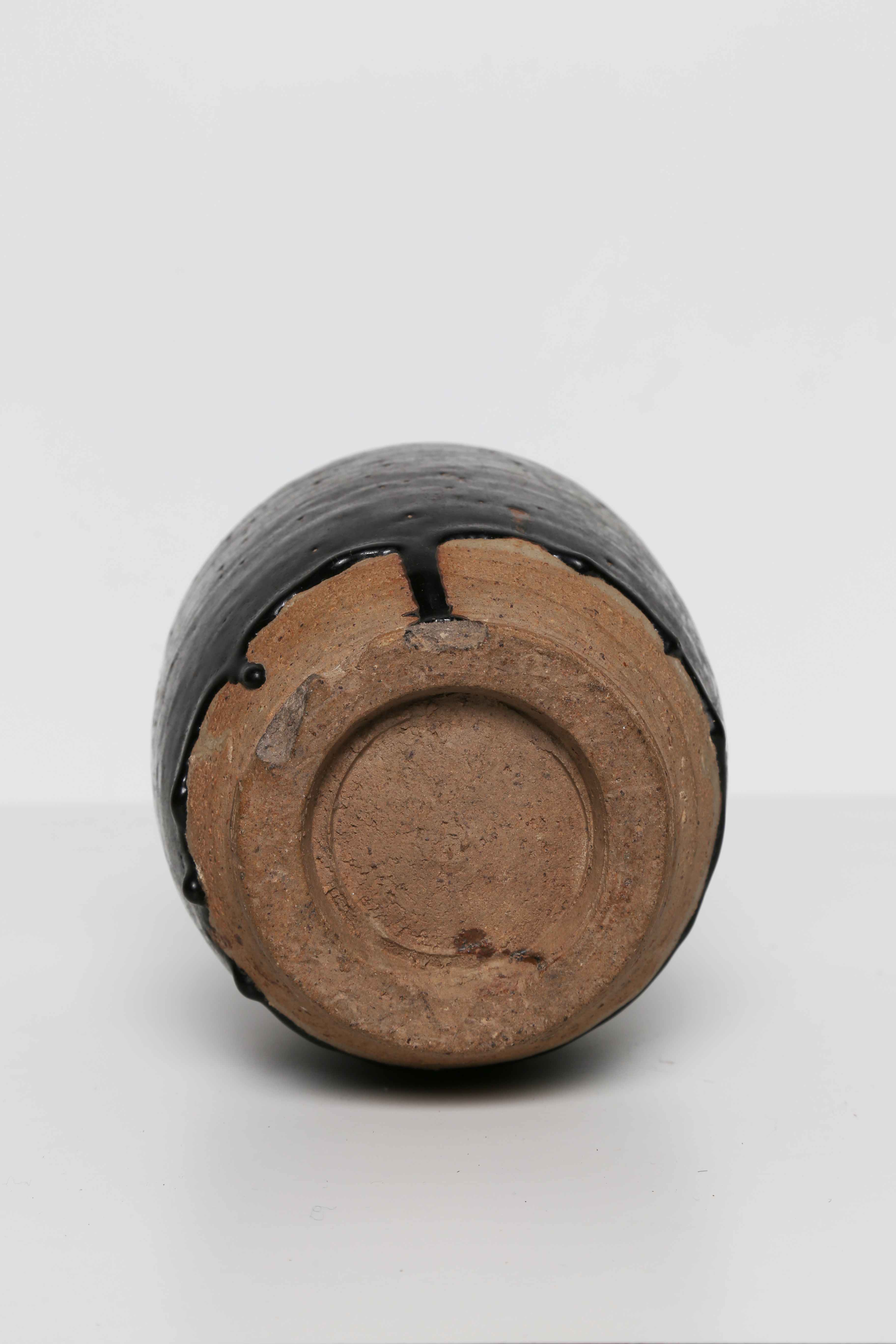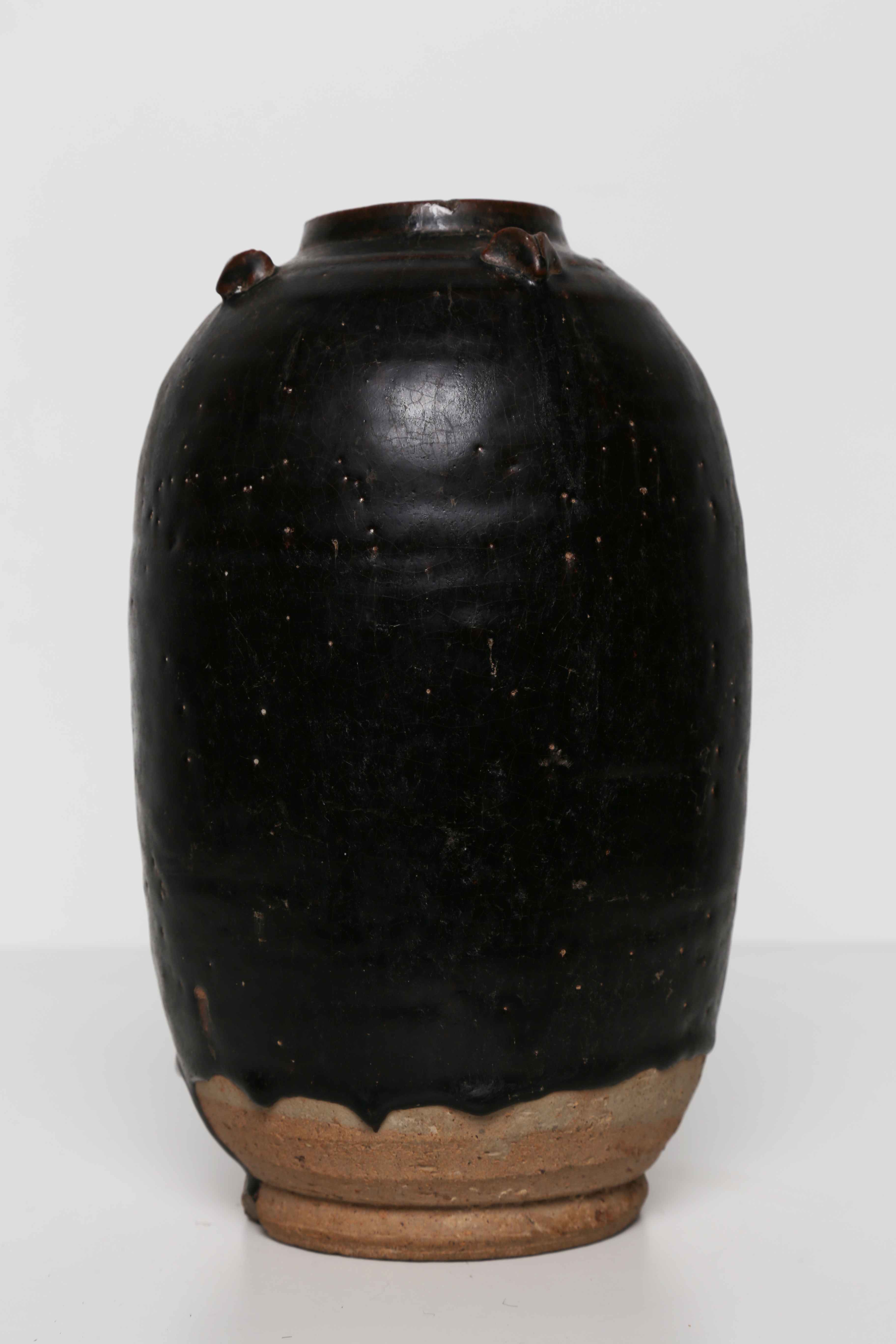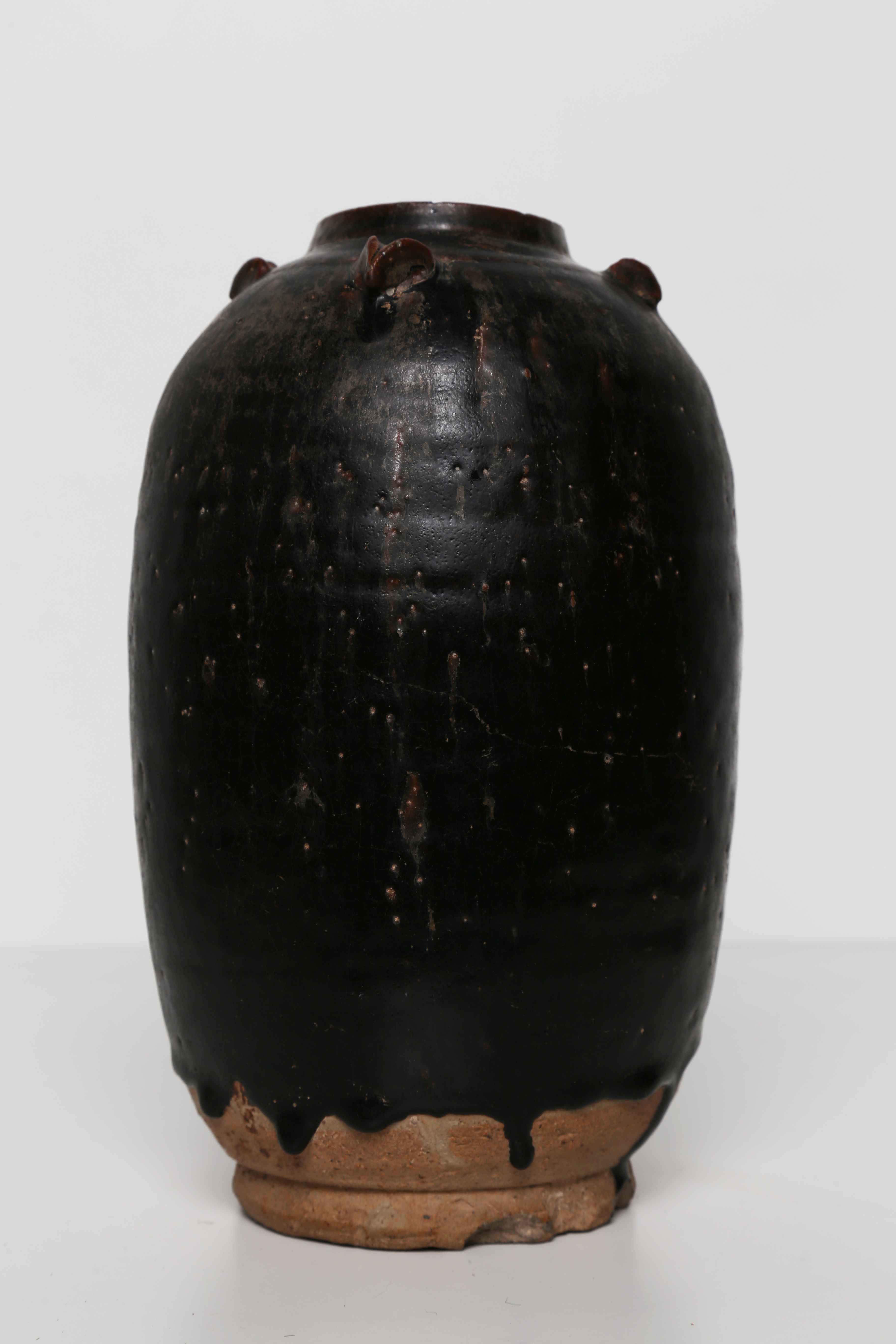 Arte Cinese Vaso ovale in terracotta Cina, dianstia Song. -. Cm 10,40 x 27,00. Poggiante su disco (con qualche sbeccatura), ricoperto di spessa vetrina marrone che termina gocciolando in prossimità del piede presente, appena sotto la bocca, dei piccoli rilievi a forma di corna.