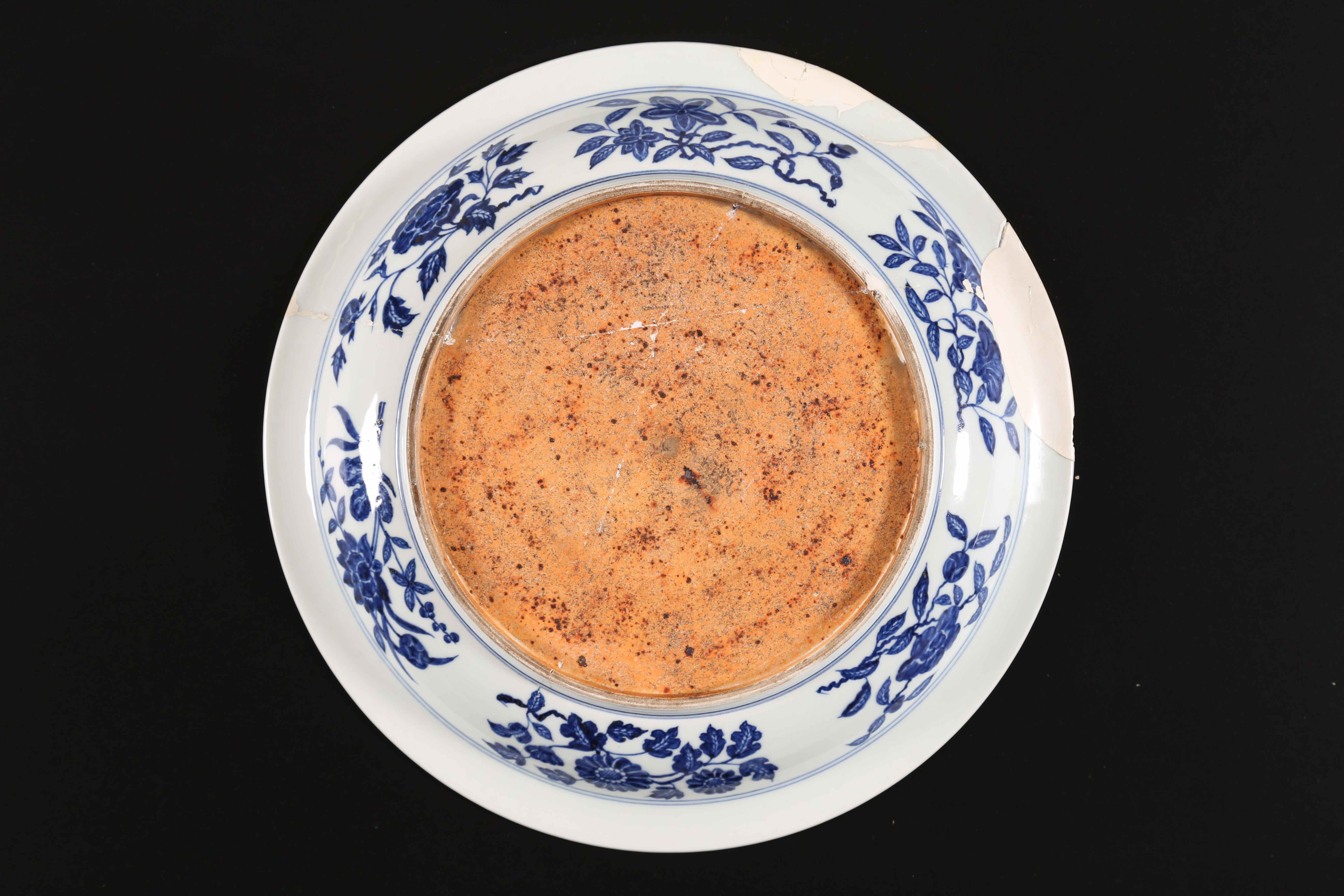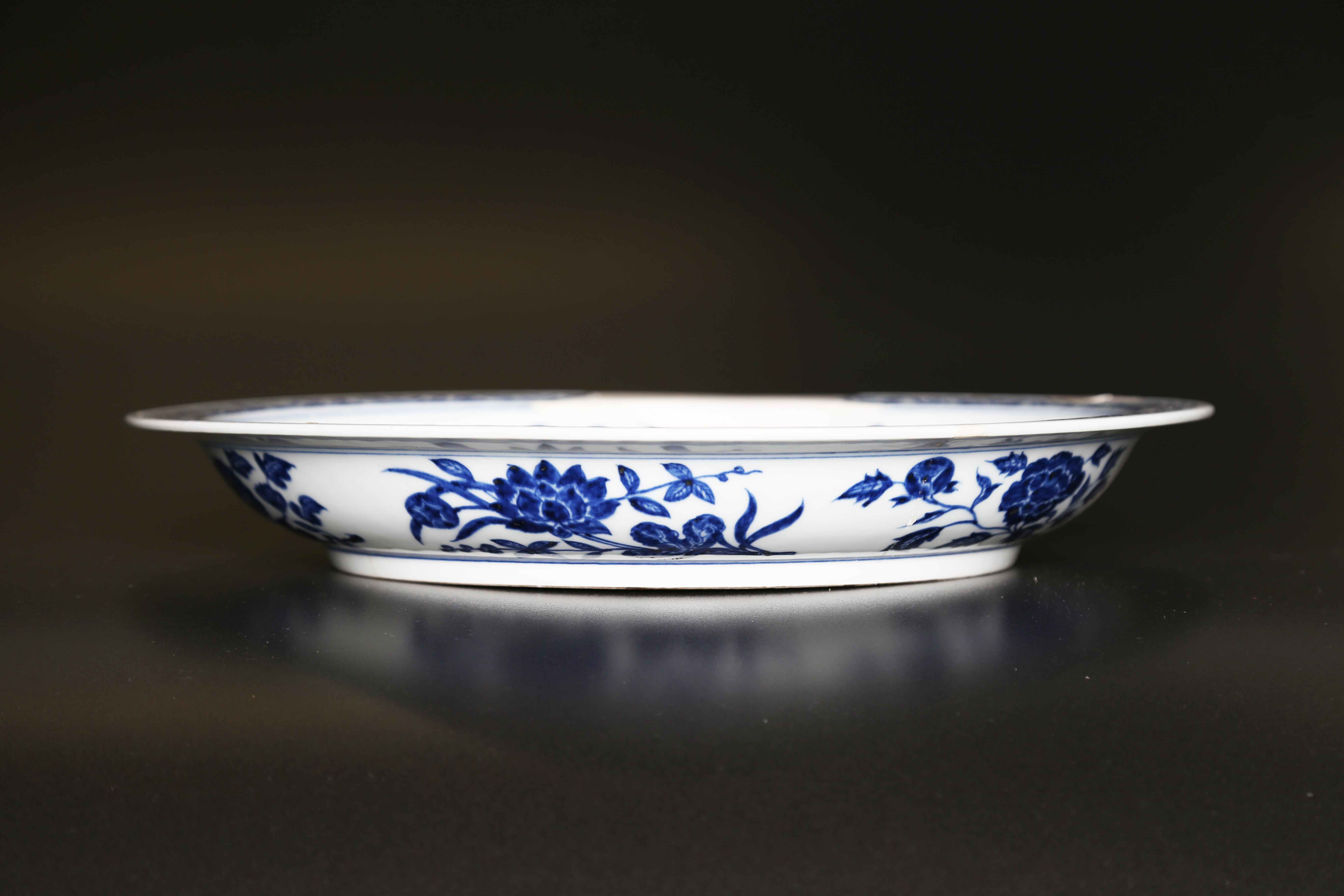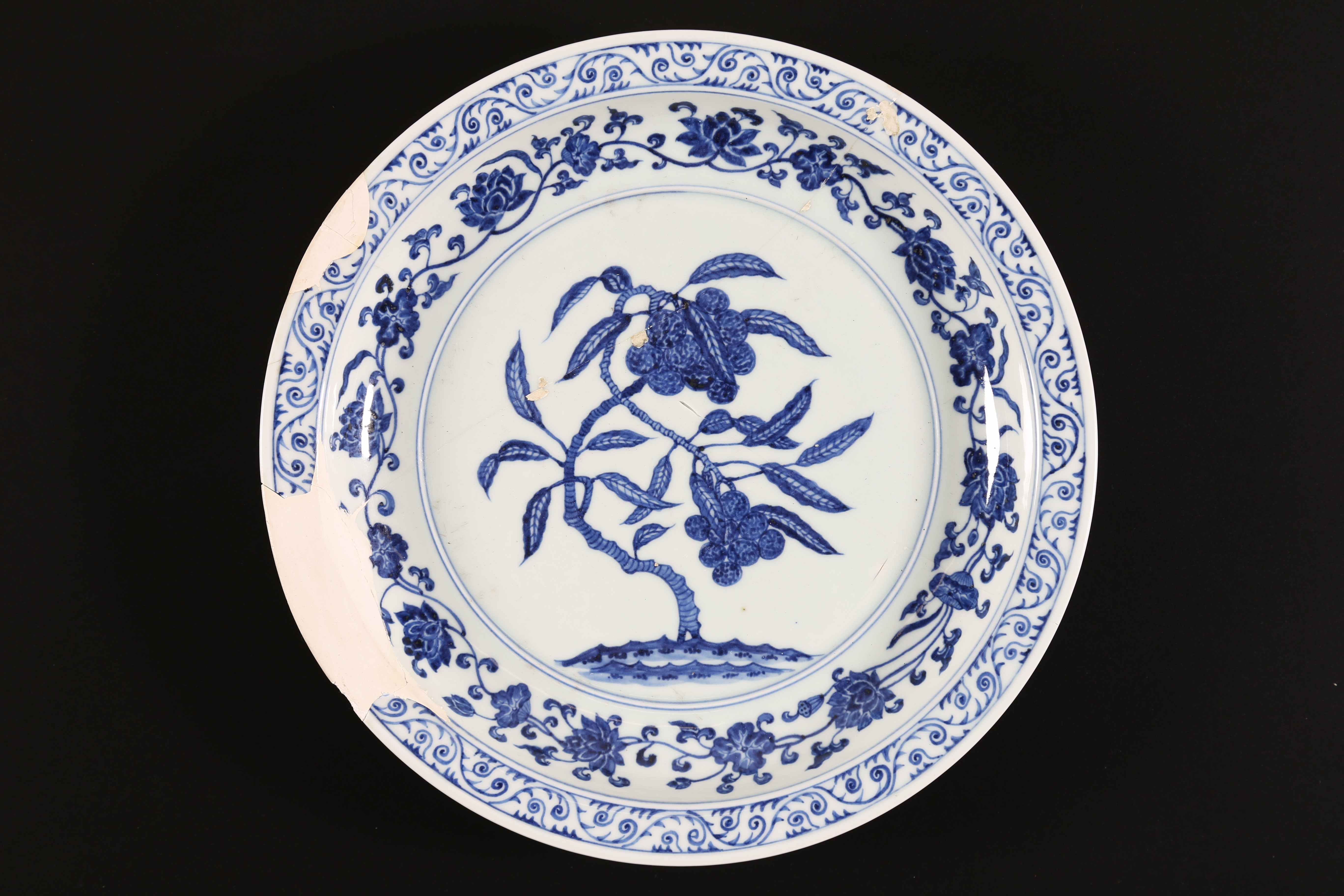 Arte Cinese Vassoio in porcellana Bianco/Blu in stile Yongle Cina. . Cm 36,50 x 5,00. Decorato con un ramo fiorito centrale, una corona di fiori di loto e tralci vegetali nel cavetto ed una fascia con il tradizionale motivo "rocce ed onde" stilizzate sulla tesa. L'esterno riprende il motivo floreale suddividendolo in sei riserve. I motivi decorativi e la loro organizzazione sulla superficie del vassoio sono un omaggio allo stile Yongle, terzo imperatore della dinastia Ming. Restauri.