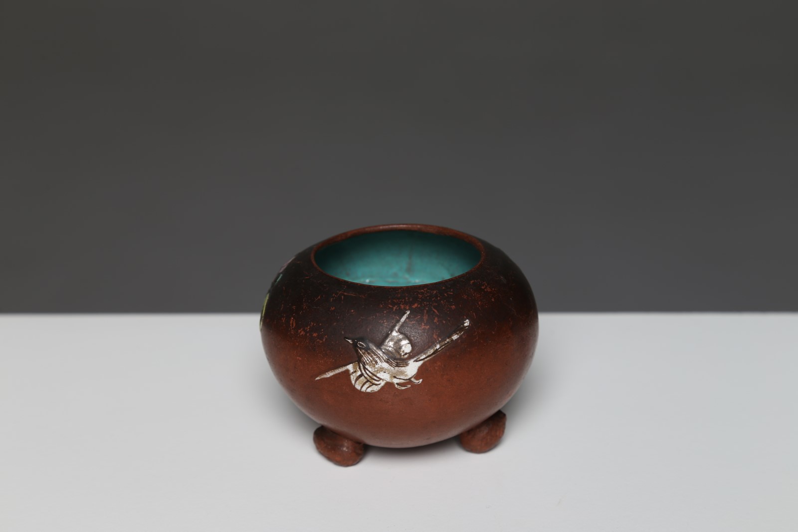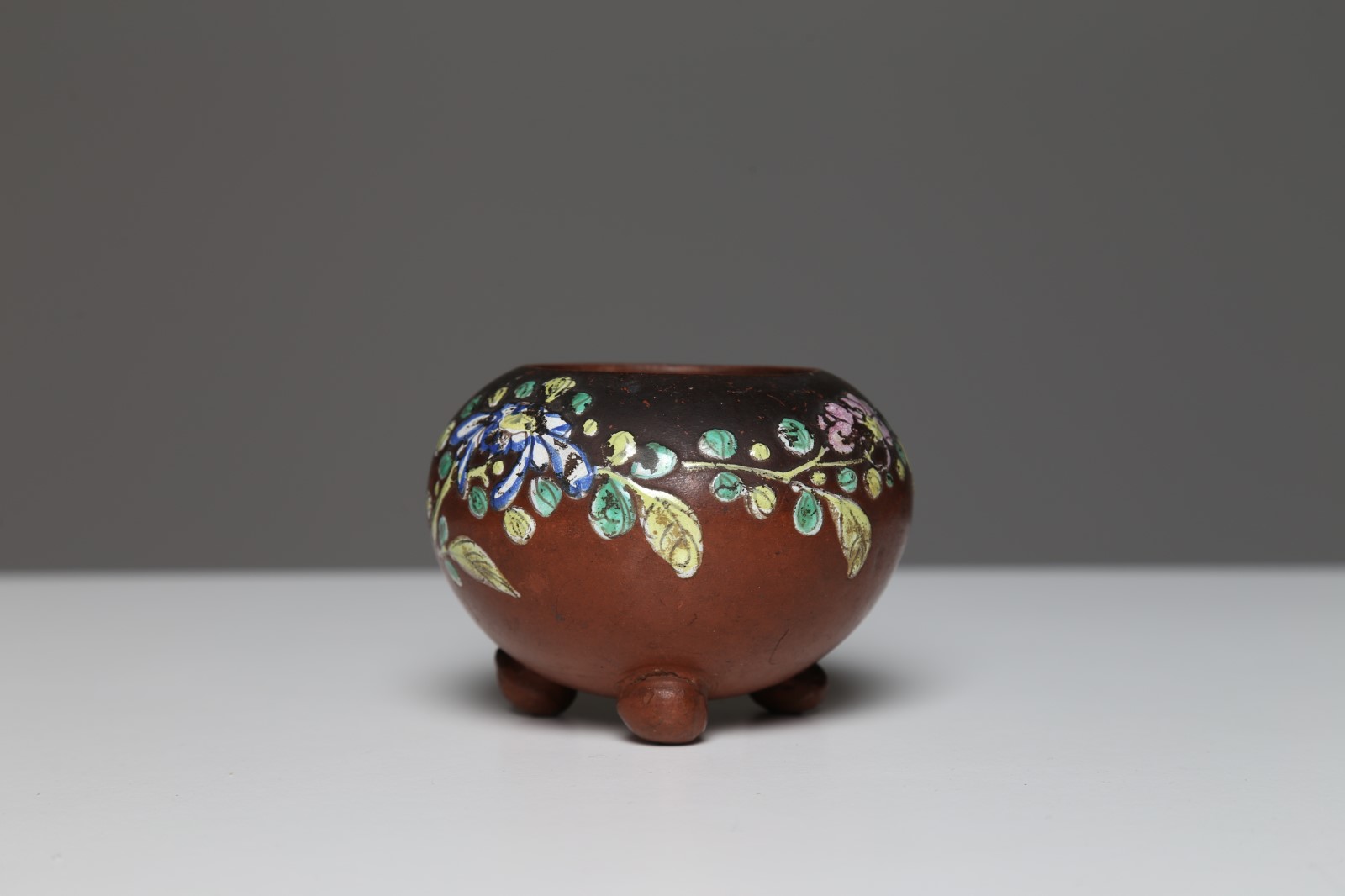 Arte Cinese Coppa Yixing in terracotta con decorazione di fiori smaltati...