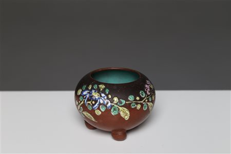 Arte Cinese Coppa Yixing in terracotta con decorazione di fiori smaltati Cina, XIX secolo. . Cm 8,50 x 7,00. Piccola coppa tripode in terracotta con interno invetriato di verde e l'esterno decorato a smalto con fiori ed uccelli.