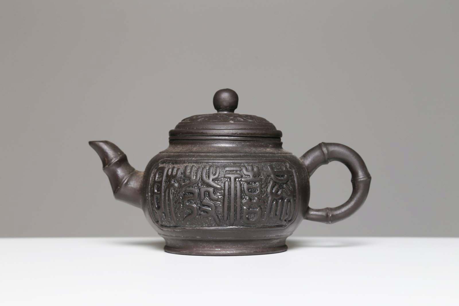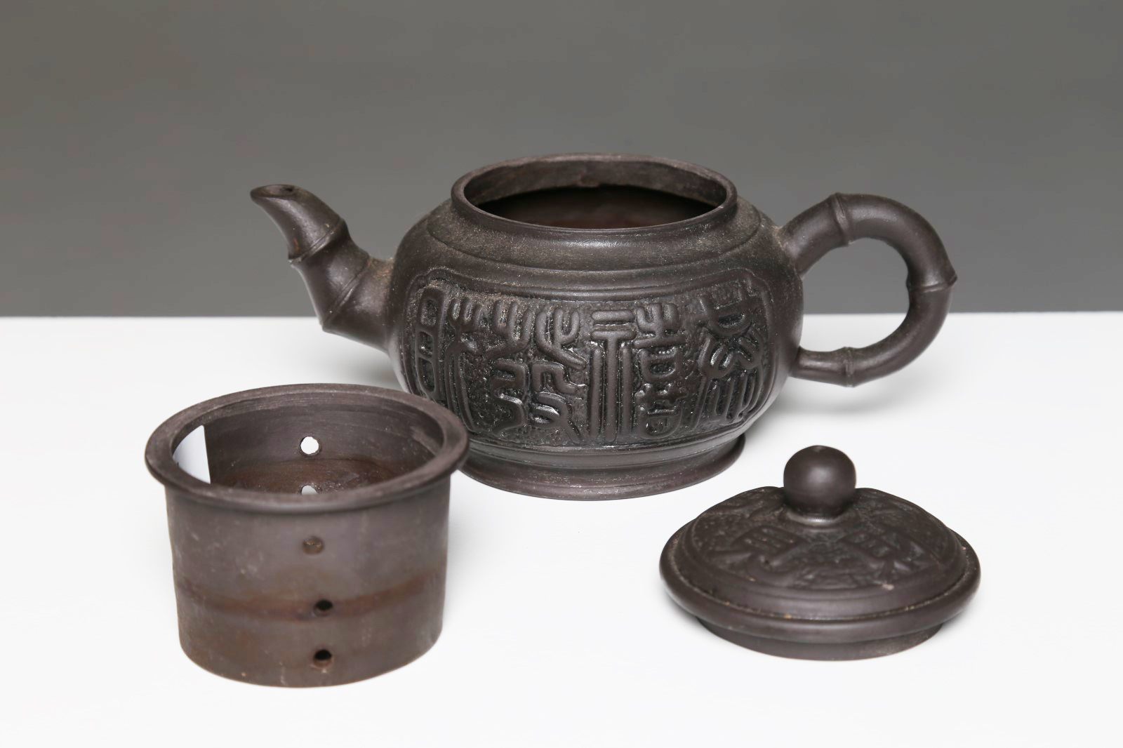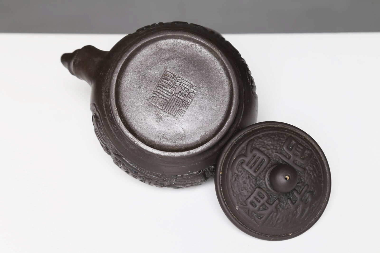 Arte Cinese Teiera Yixing in terracotta scura Cina, XX secolo. . Cm 14,00. Teiera in terracotta decorata con iscrizioni benaugurali relative ad abbondanza e ricchezza e bambini che giocano Presenta marchio sulla base.