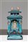 Arte Cinese Modello di pagoda in terracotta invetriata di turchese con figura centrale Cina, dinastia Ming, XVI secolo. . Cm 14,00 x 30,00 x 9,00. Modellino di edificio in porcellana invetriata con figura assisa centrale ed animali benaugurali sui lati.