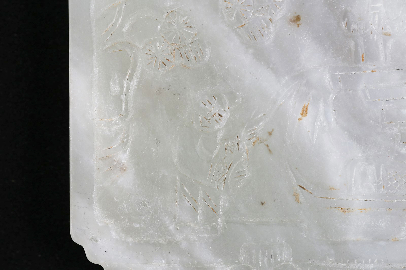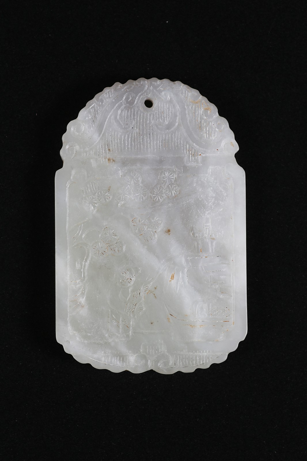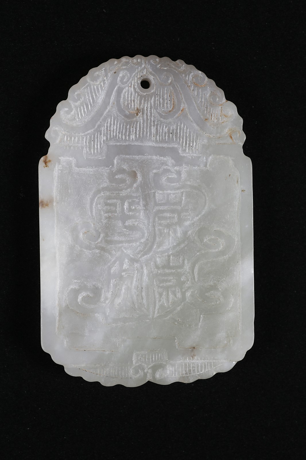 Arte Cinese Pendente in giada bianca inciso con ideogrammi Cina, XIX secolo. -. Cm 4,70 x 7,10. Forma rettangolare con profili lobati