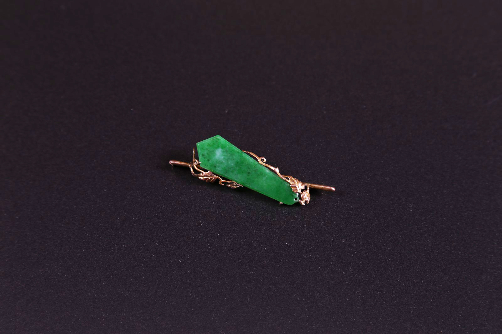 Arte Cinese Spilla in oro e giadeite Cina/Europa, XX secolo. -. Cm 6,50. Spilla di gusto decò con giadeite centrale sagomata a freccia, racchiusa tra due tralci di foglie dorati.