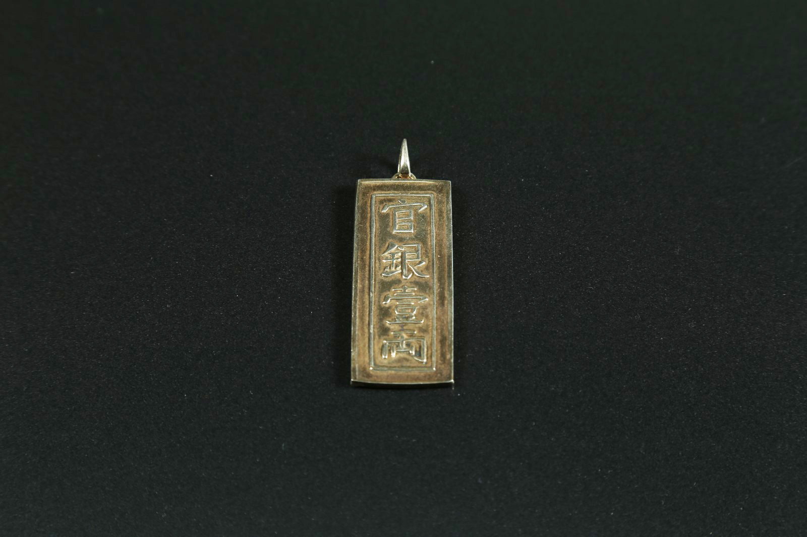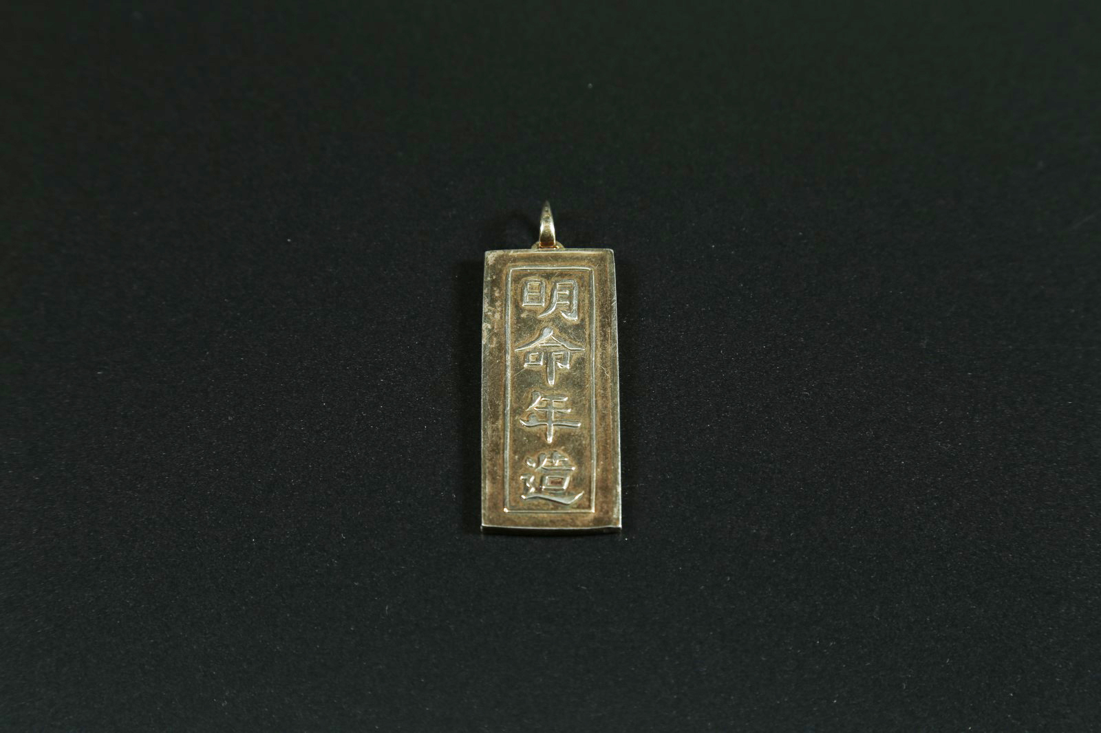 Arte Cinese Pendente in argento Vermeil Cina, XX secolo. -. Cm 5,50. Pendente rettangolare con iscritto "costruito nella dinastia Ming".