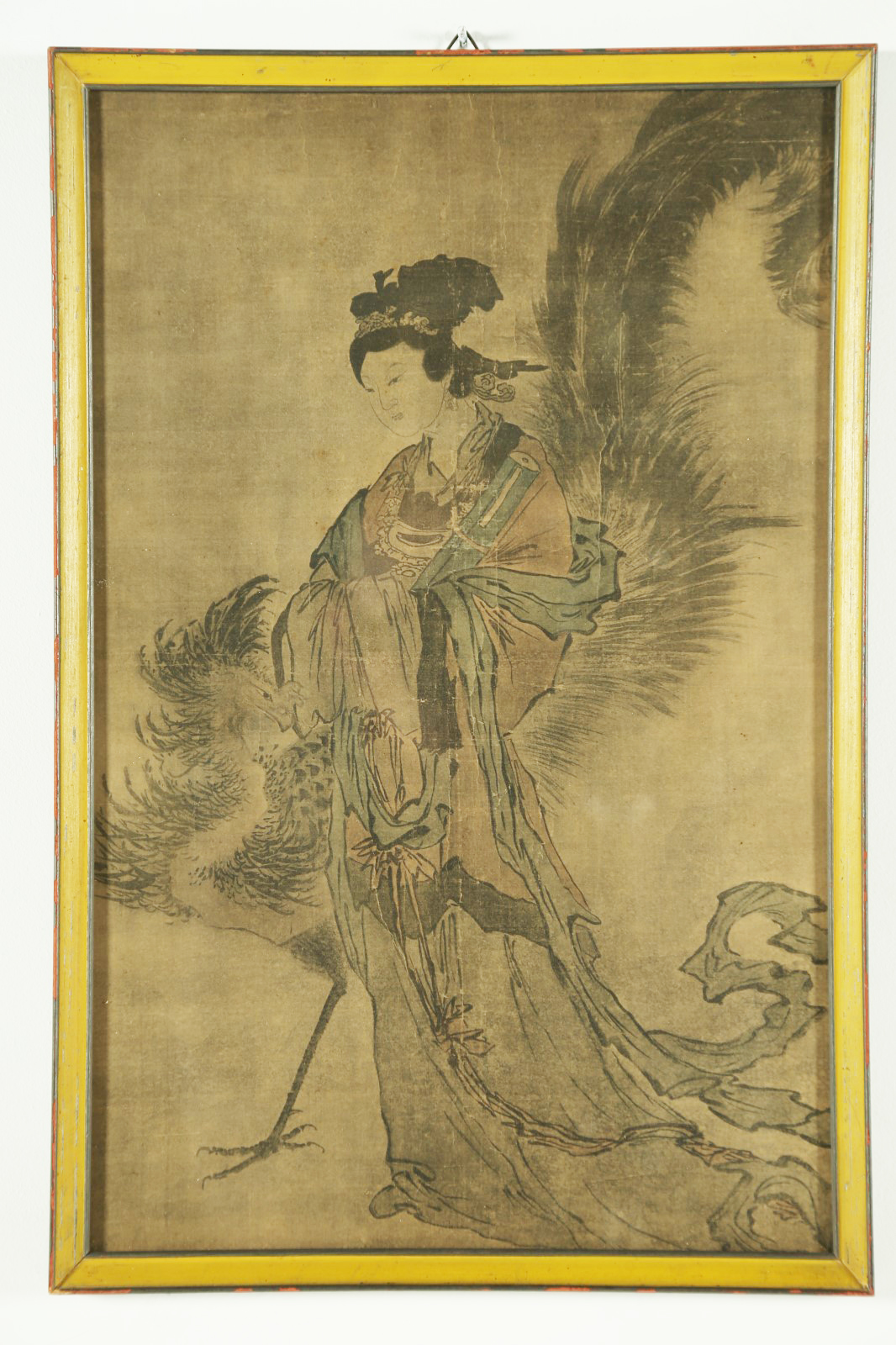 Arte Cinese Stampa raffigurante una dama ed un gallo Cina, XX secolo Tecnica mista su carta . . Cm 30,00 x 46,00.