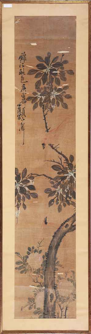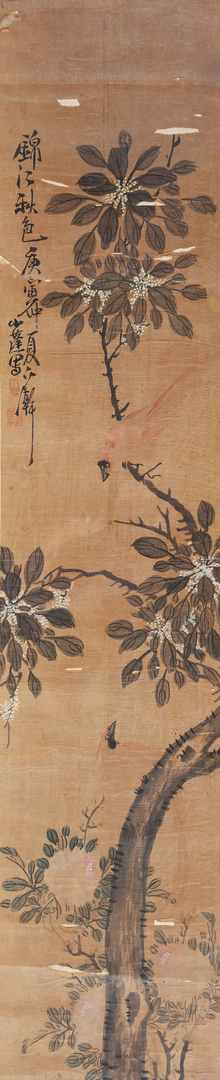 Arte Cinese Xiao Peng (1812 - anno di morte non noto) Paesaggio autunnale del Jinjiang. Firmato e datato Cina, XIX secolo. -. Cm 38,70 x 138,30. Dipinto su seta di formato verticale caratterizzato da una composizione su tre piani, il primo dei quali mostra delle peonie. Il dipinto è firmato e datato alla terza decina del secondo mese della stagione estiva del 1830/90, secondo il ciclo sessagesimale cinese. Zhang Xiao Peng: Originario dell'attuale regione dello Hebei, calligrafo e poeta, esperto nei generi di pittura di fiori, uccelli e paesaggi. Le misure indicate comprendono la sottile cornice in legno scuro.