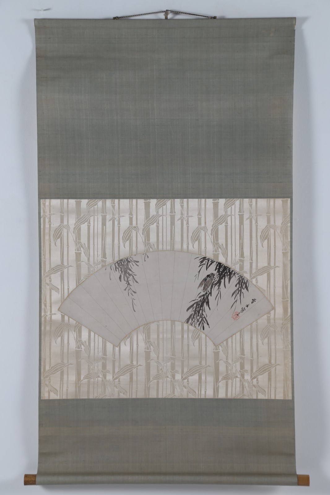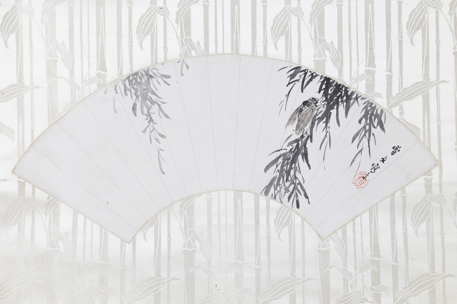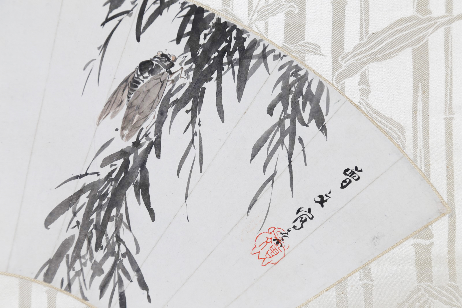 Arte Giapponese Morikawa Sobun (1847 - 1902) Dipinto raffigurante una cicala su un ramo con firma e sigillo Giappone, periodo Meiji 1868 - 1912, seconda metà del XIX secolo Inchiostro e colori su carta . -. Cm 49,00 x 61,00. Sul formato semircircolare del ventaglio è raffigurata una cicala -simbolo di prosperità- sul ramo di un salice. Il dipinto è montato su un broccato in seta color ocra. Misure totali: 62,6 X h. 115 cm Scatola non originale.