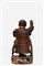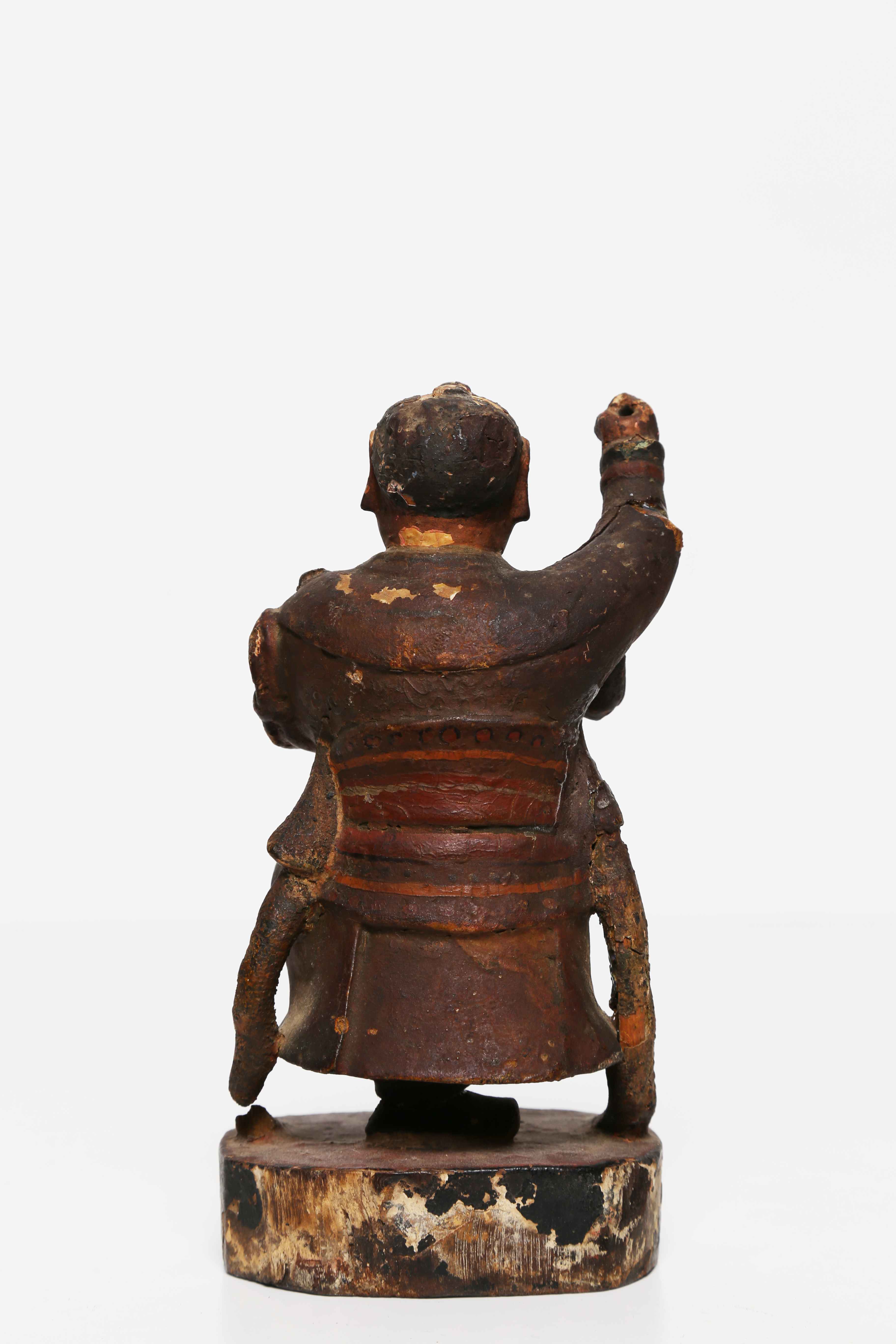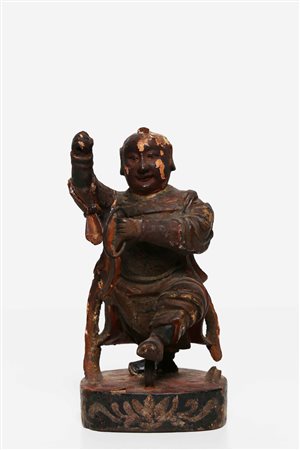 Arte Cinese Figura in legno Cina, dinastia Qing, XIX secolo. -. Cm 9,80 x 19,00 x 8,40. Poggiante su base dipinta con motivi floreali, la figura (probabilmente un Lokapala) è scolpita in movimento con gli arti alzati. Presenta un anello nella mano sinistra ed un foro passante per la destra, probabilmente in origine reggeva una spada, ora perduta. Danni.