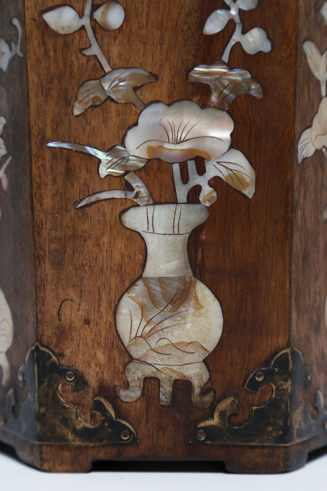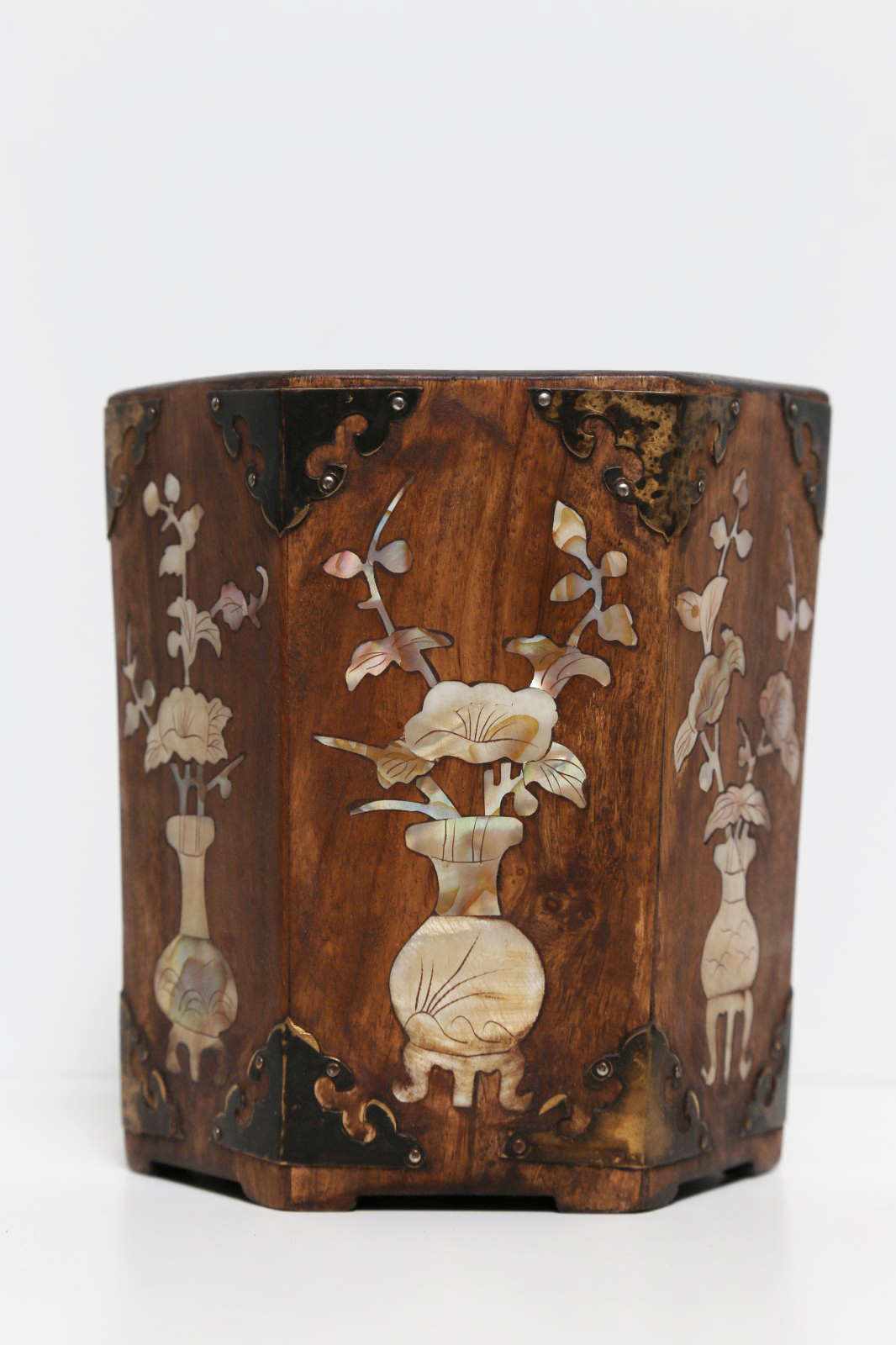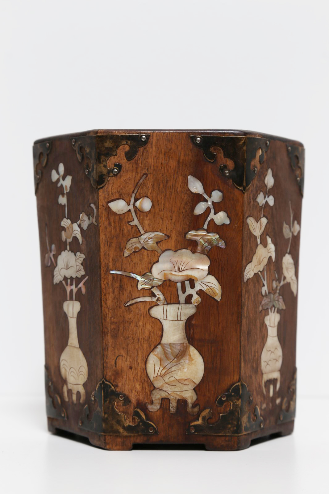 Arte Cinese Portapennelli esagonale in legno intarsiato con madreperla Cina, XIX - XX secolo. -. Cm 17,00 x 18,00.