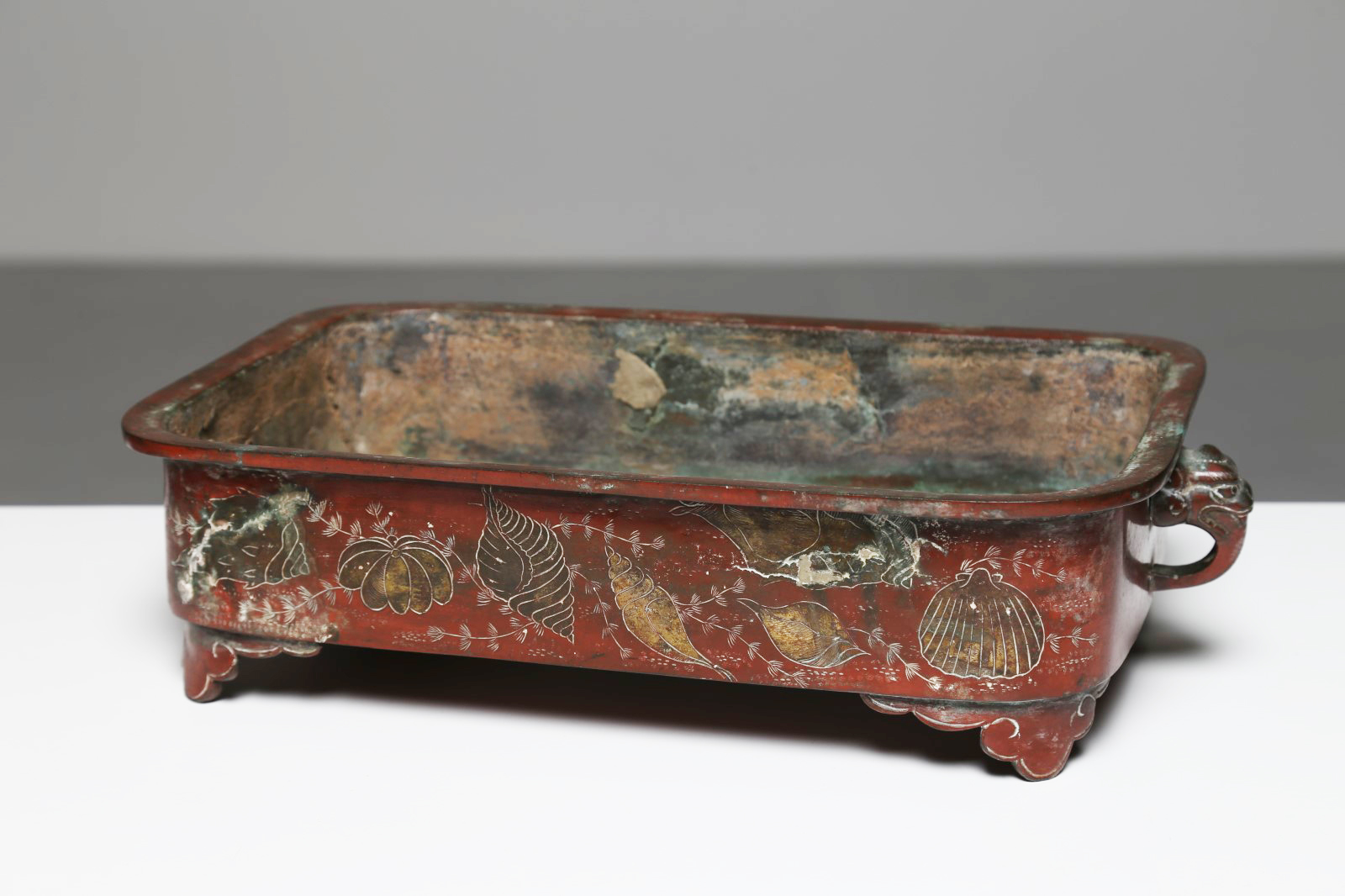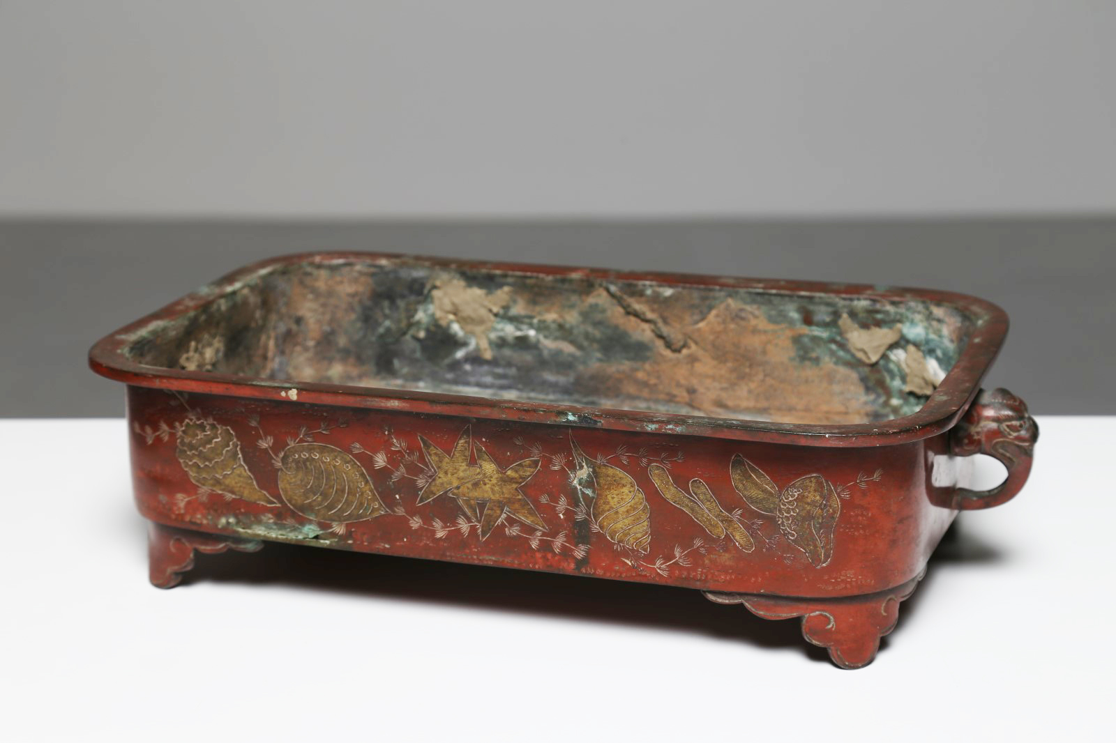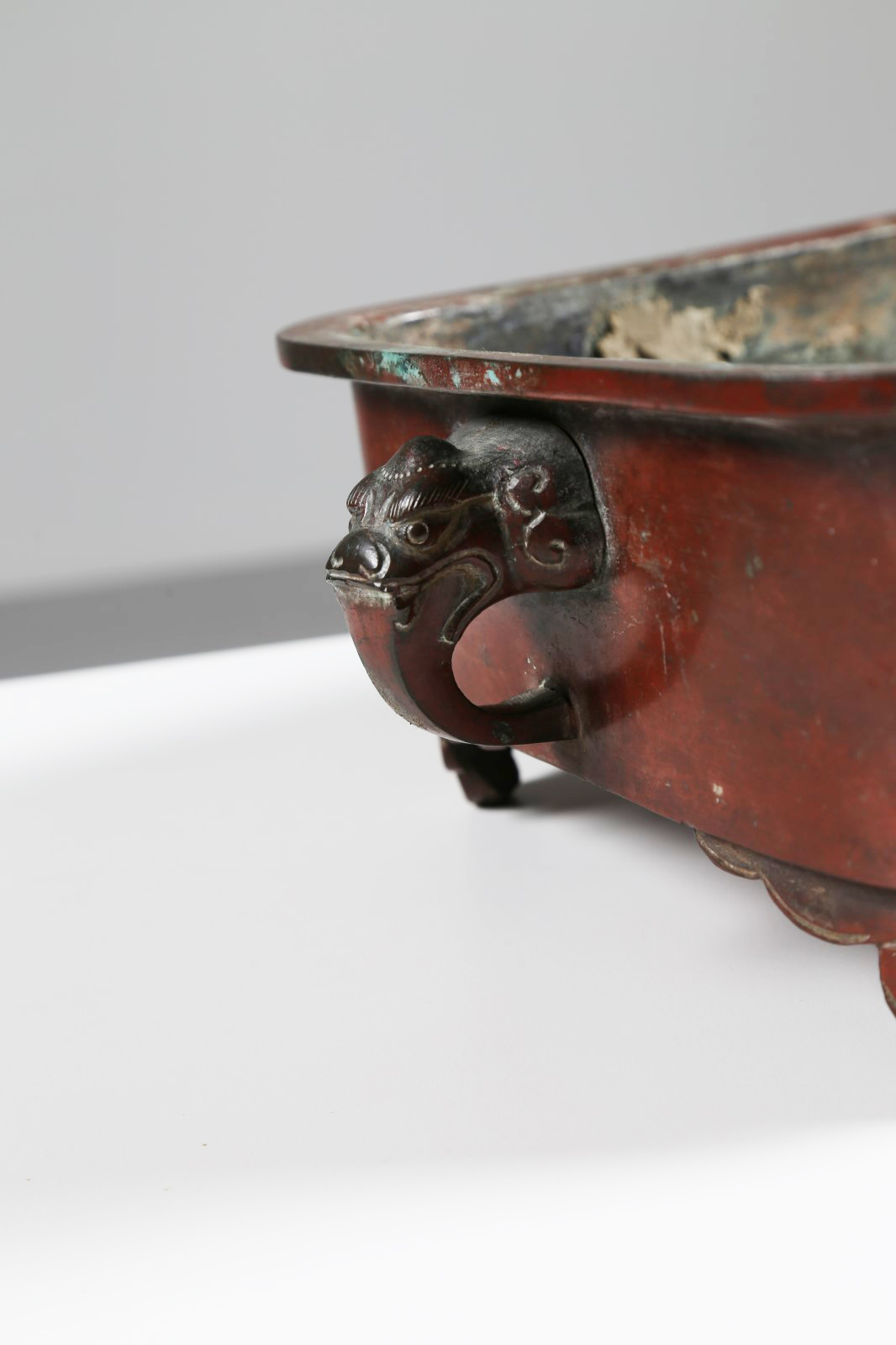 Arte Cinese Giardiniera in bronzo decorata con motivi acquatici Cina, XVII secolo. . Cm 45,00 x 11,00 x 27,00. Bella giardiniera rettangolare poggiante su quattro piedi sagomati e recante incisioni parzialmente dorate a motivo di conchiglie e stelle marine.