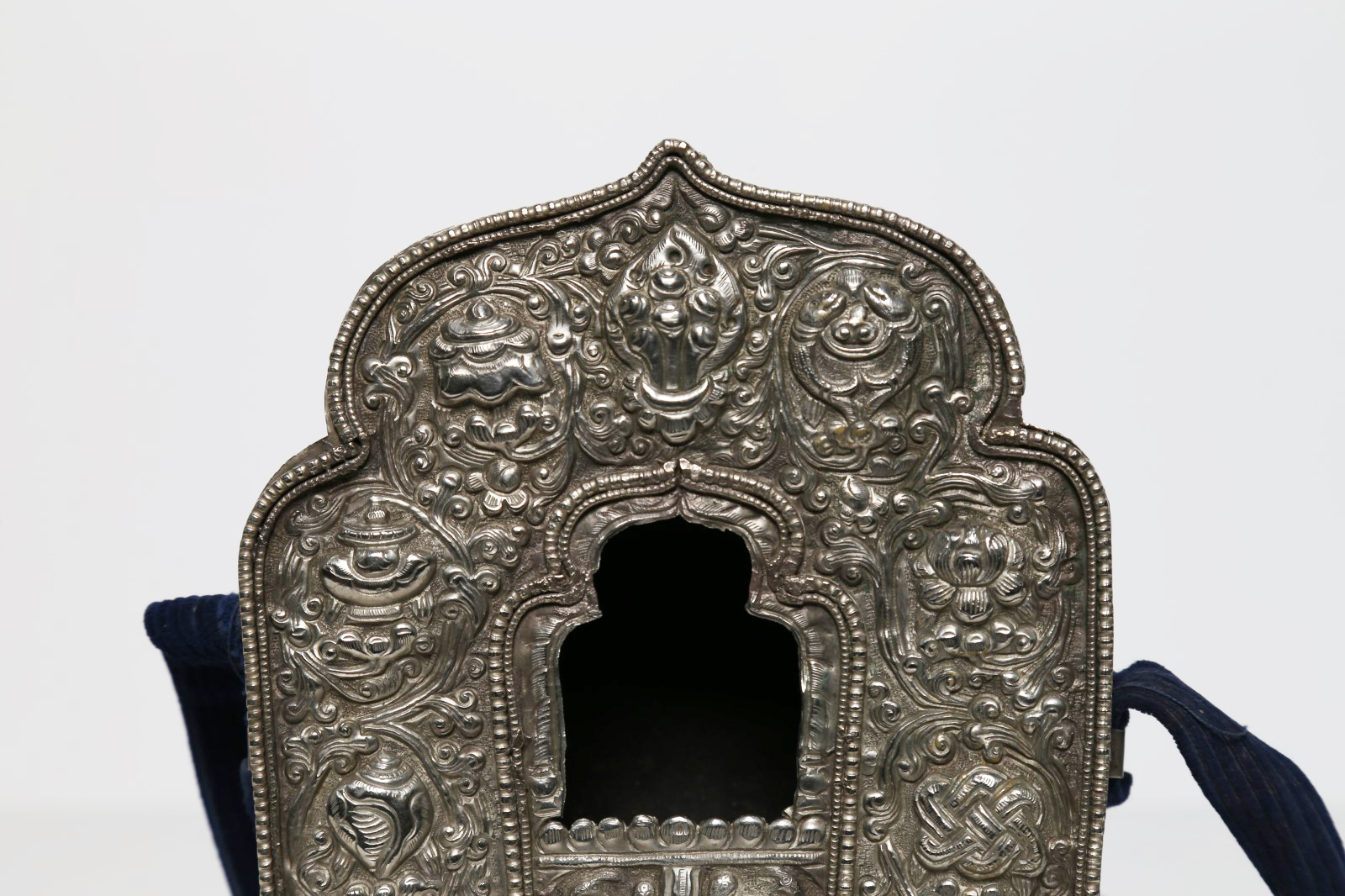 Arte Himalayana Gau in argento sbalzato Tibet, fine XIX secolo. -. Cm 13,00 x 18,00 x 7,50. Il coperchio del porta preghiere è decorato con gli otto emblemi buddisti.