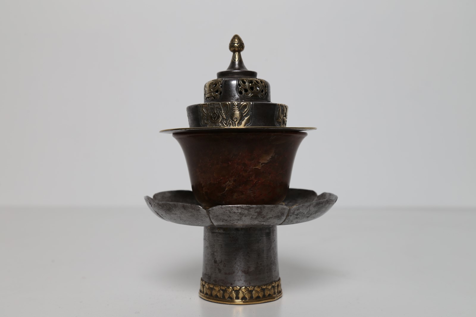 Arte Himalayana Tazza in pietra dura con coperchio e base in argento...