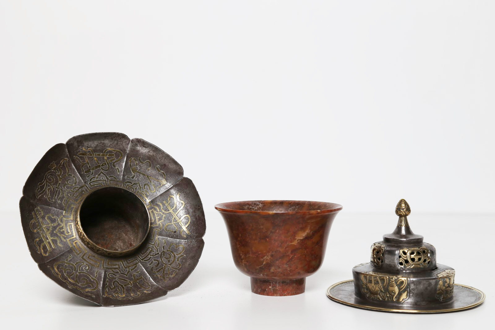 Arte Himalayana Tazza in pietra dura con coperchio e base in argento intarsiato Tibet, XIX secolo. -. Cm 12,00 x 19,00. Decorata con i simboli del buon auspicio laminati in oro.