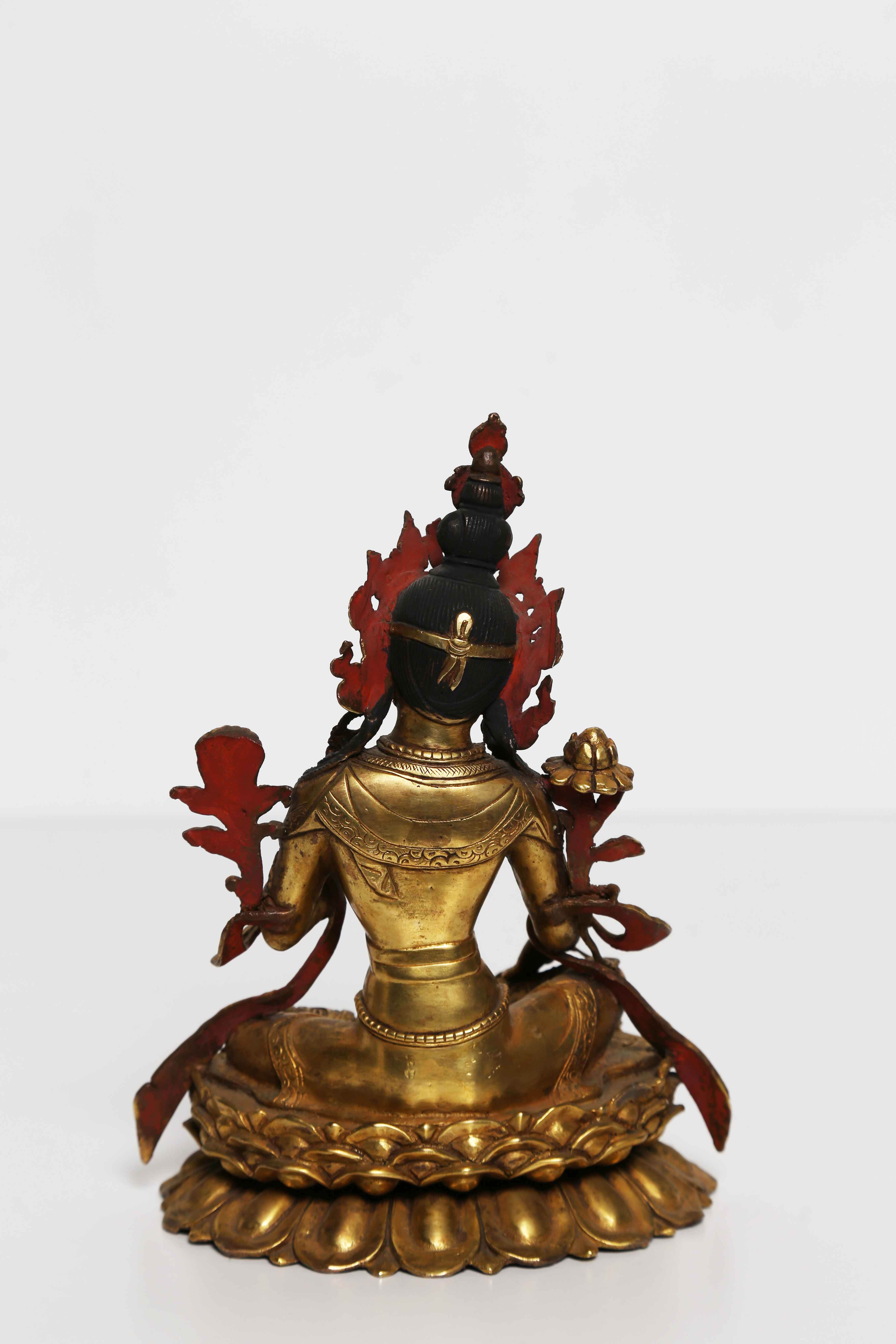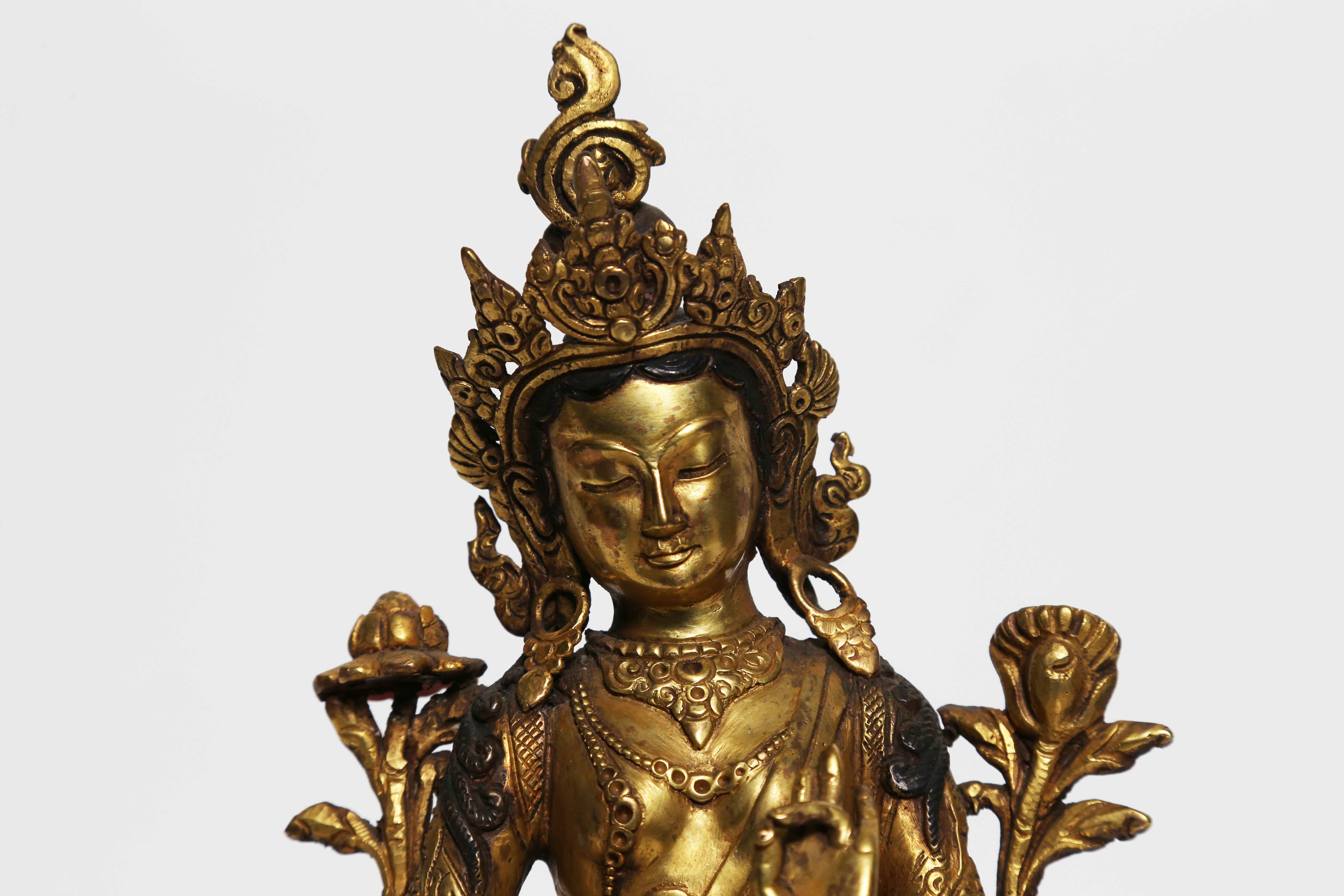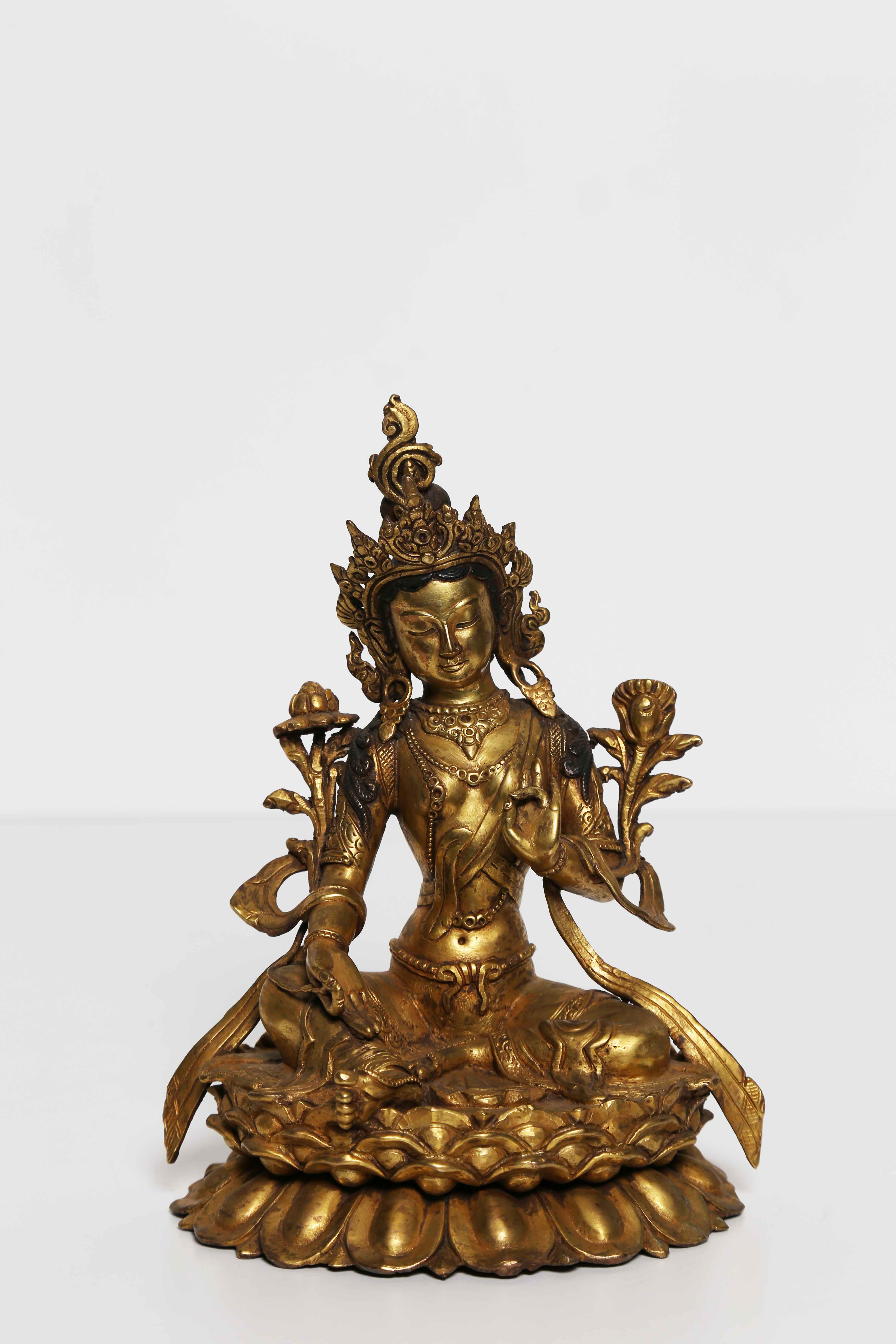 Arte Himalayana Statua in bronzo dorato raffigurante Tara Verde Nepal, inizi XX secolo. -. Cm 14,80 x 20,00 x 12,50. Raffigurante l'emanazione del bodhisattva Avalokitesvara Tara Verde (Symatara) rappresentata nella sua forma canonica con due fiori di loto.