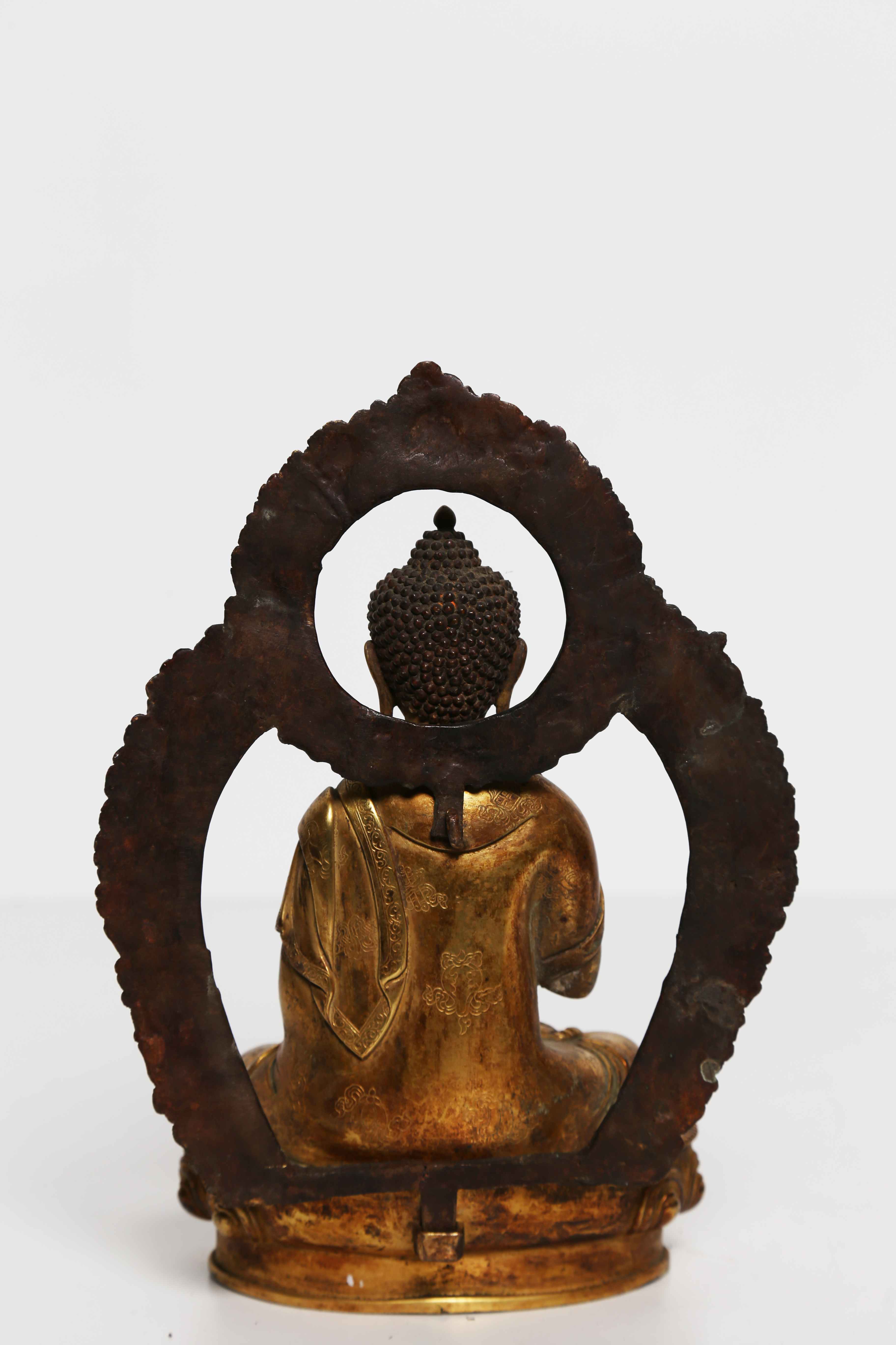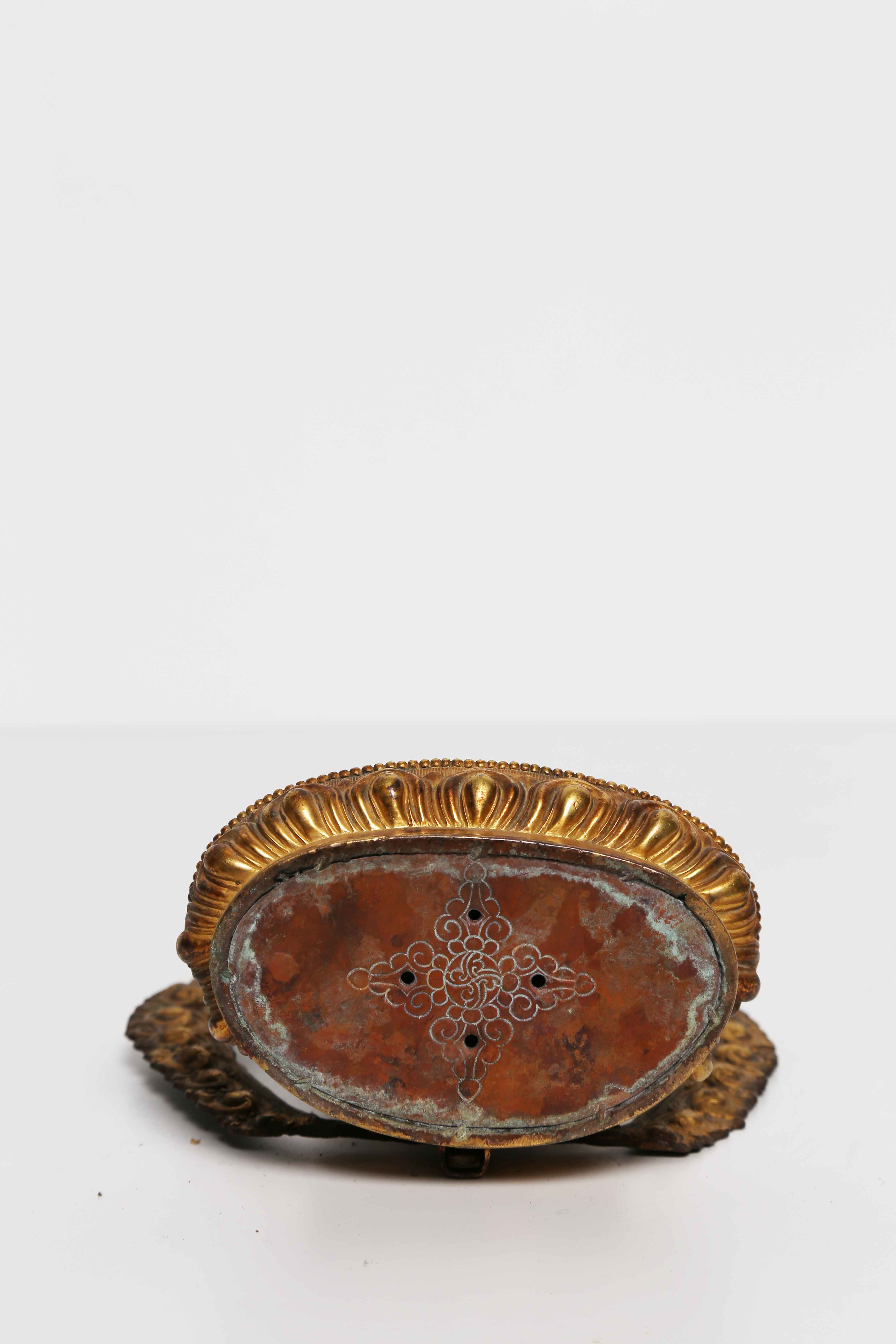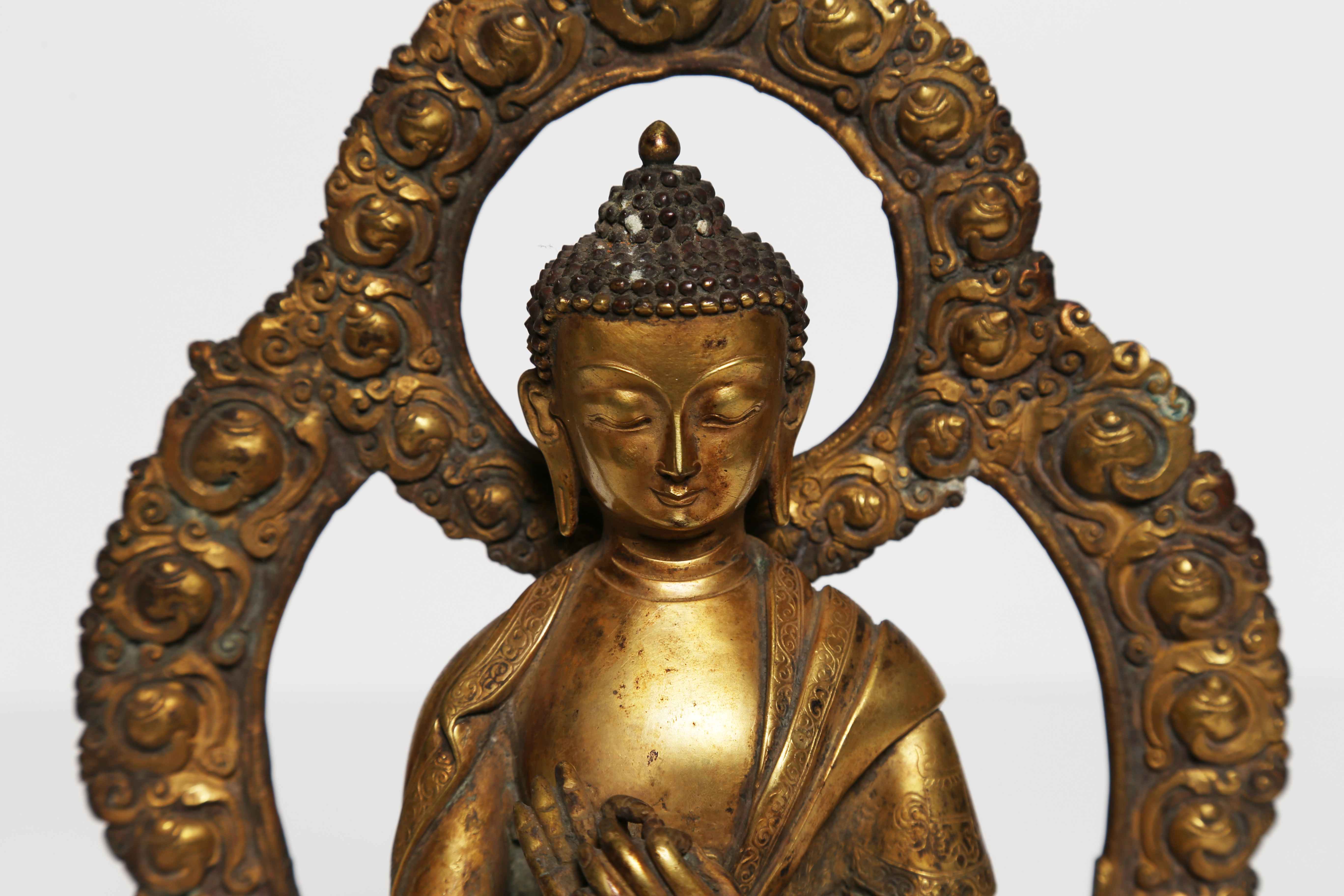 Arte Himalayana Statua in bronzo dorato raffigurante Visvabhu Tibet, inizi XX secolo. -. Cm 12,00 x 23,00 x 7,20. Fusione raffigurante uno dei sette Buddha antecedenti seduto su una base di loto su cui si innesta un'aureola trilobata fiammeggiante. Dimensioni della base