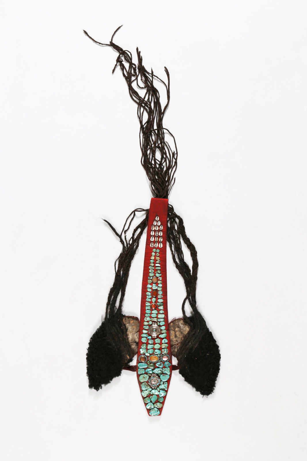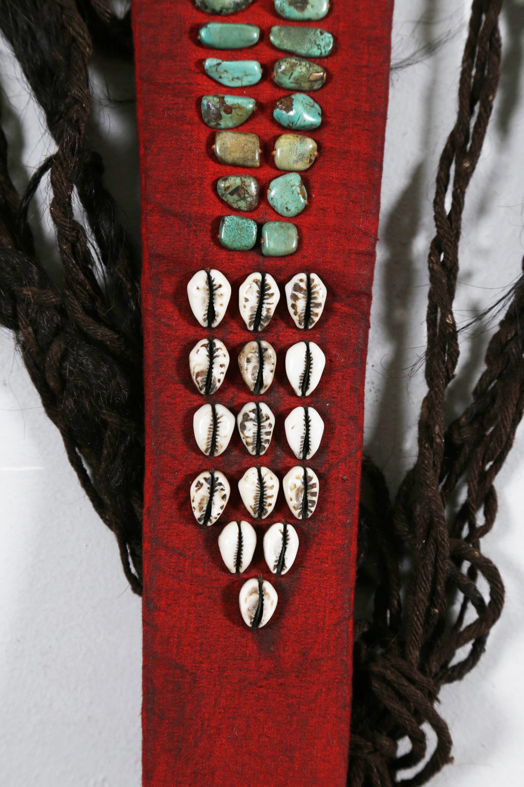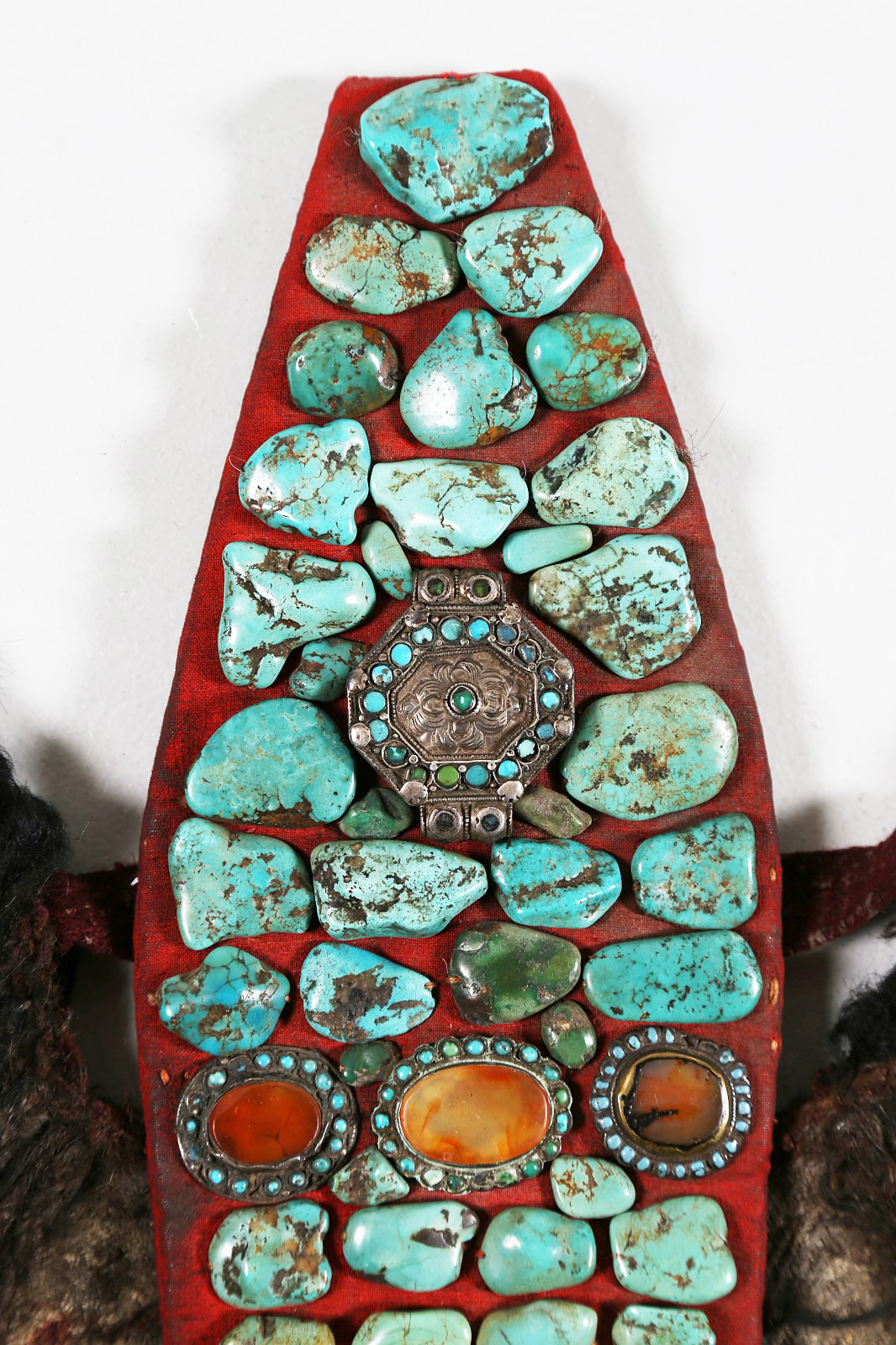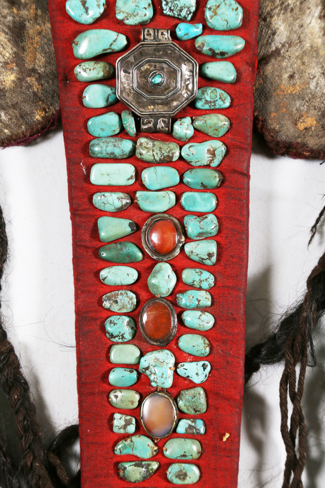 Arte Himalayana Copricapo femminile (Perak) himalayano Ladhak, XIX secolo . -. Cm 75,00. Copricapo tipico significativo nell'individuazione del rango d'appartenenza poichè il numero di file di turchesi indica il rango (9 per la regina). L'oggetto è tempestato di pietre semi-preziose tra cui turchesi e corniole e due piccoli Gau in argento con turchese incastonato e conchiglie.