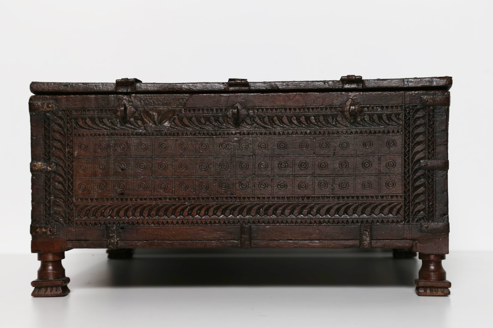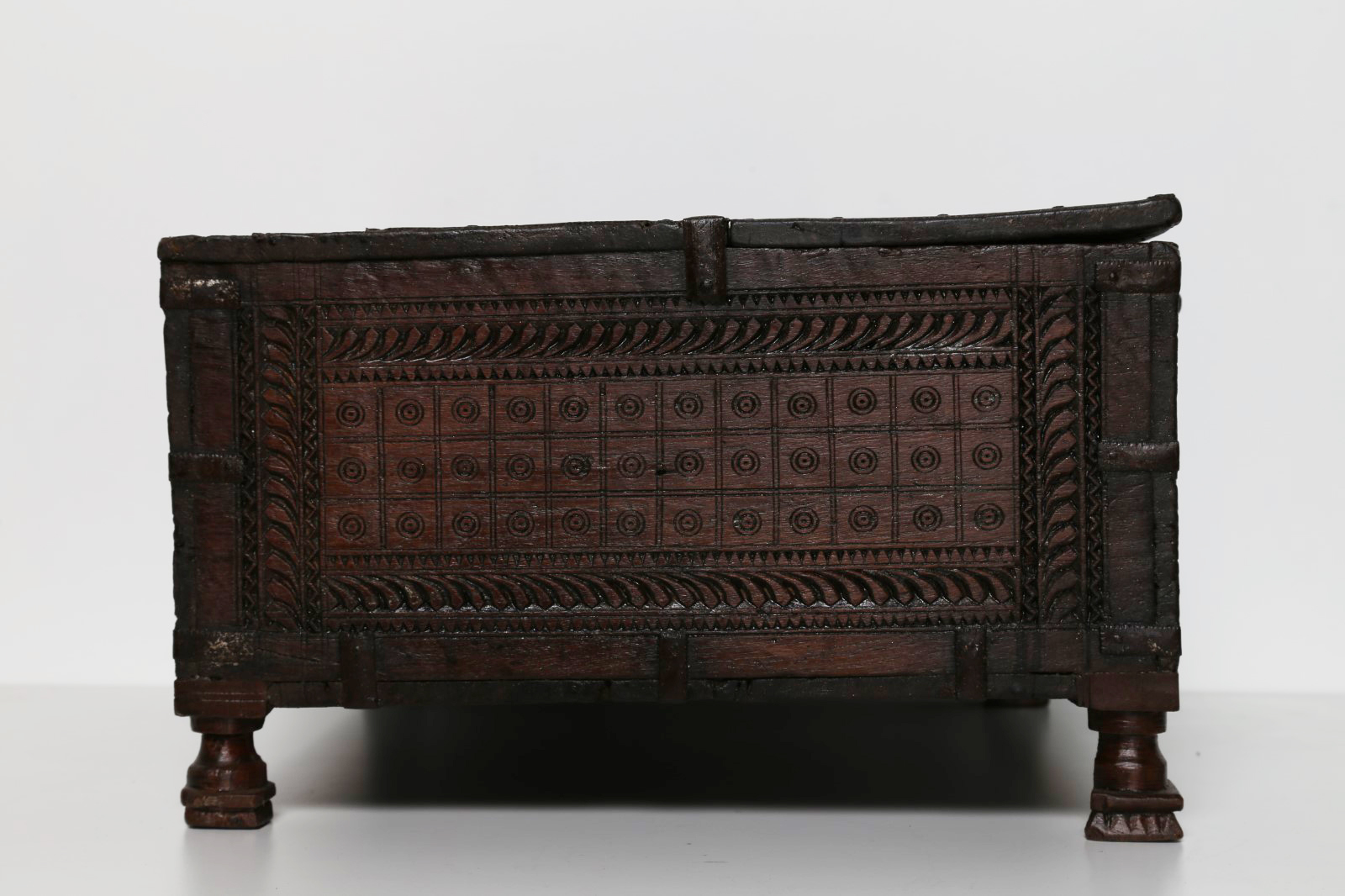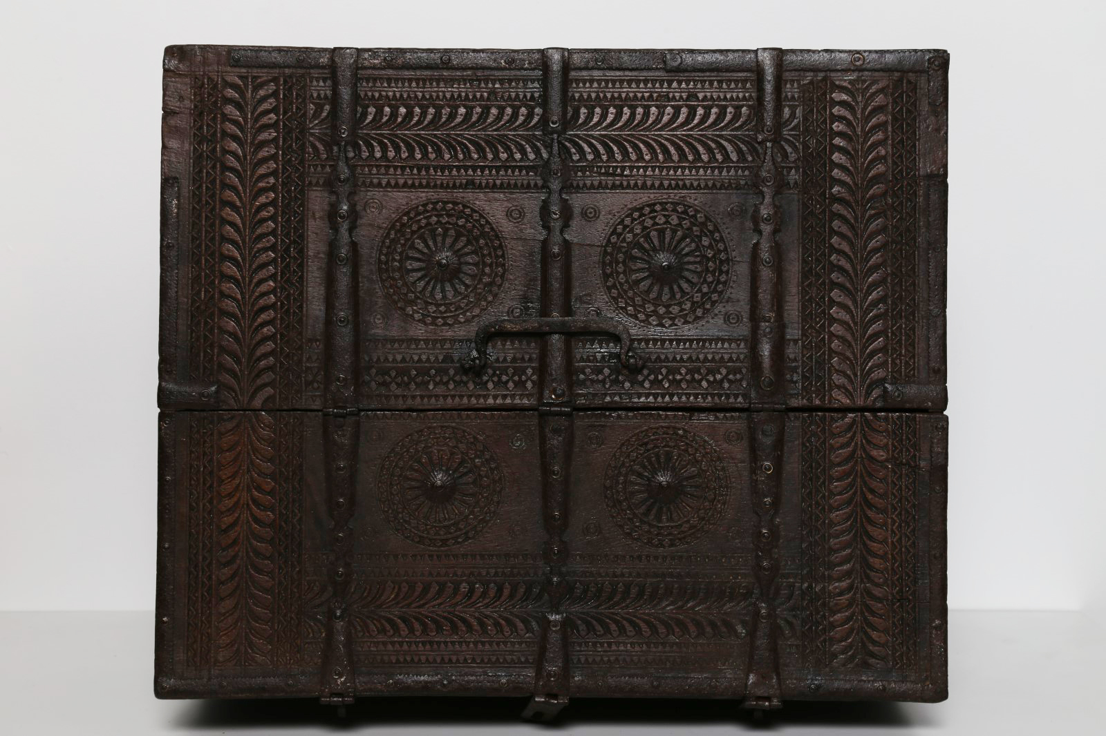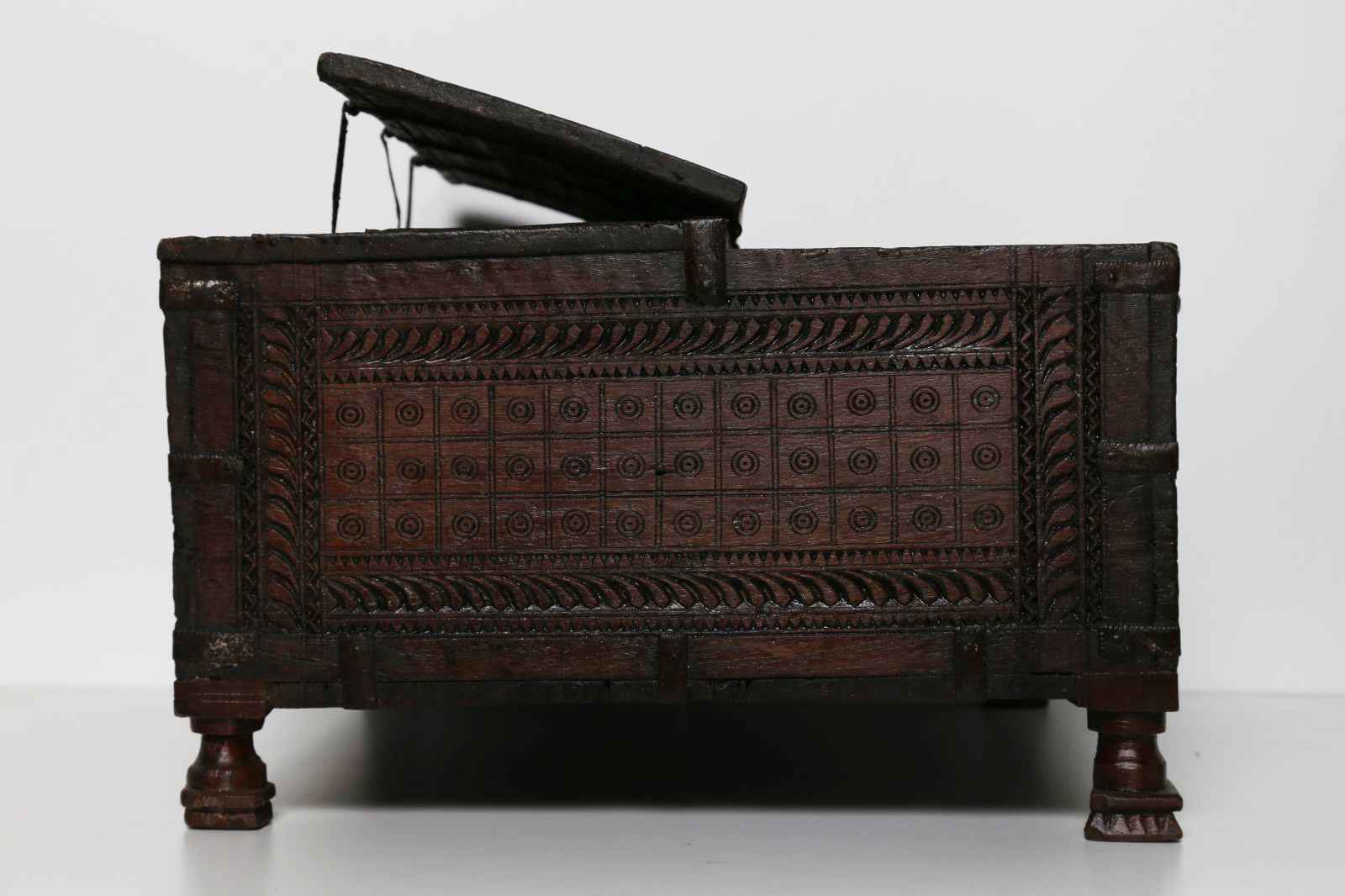 Arte Indiana Scrigno in legno intagliato India, Rajasthan, fine XVIII - inizio XIX secolo. -. Cm 44,00 x 21,00 x 36,50. Scrigno poggiante su quattro piedini rettangolari, le pareti intagliate con motivo fitoforme e griglia con decorazione circolare. Il coperchio incernierato e suddiviso in due traverse si apre si un interno con piccoli scomparti sulla sinistra.