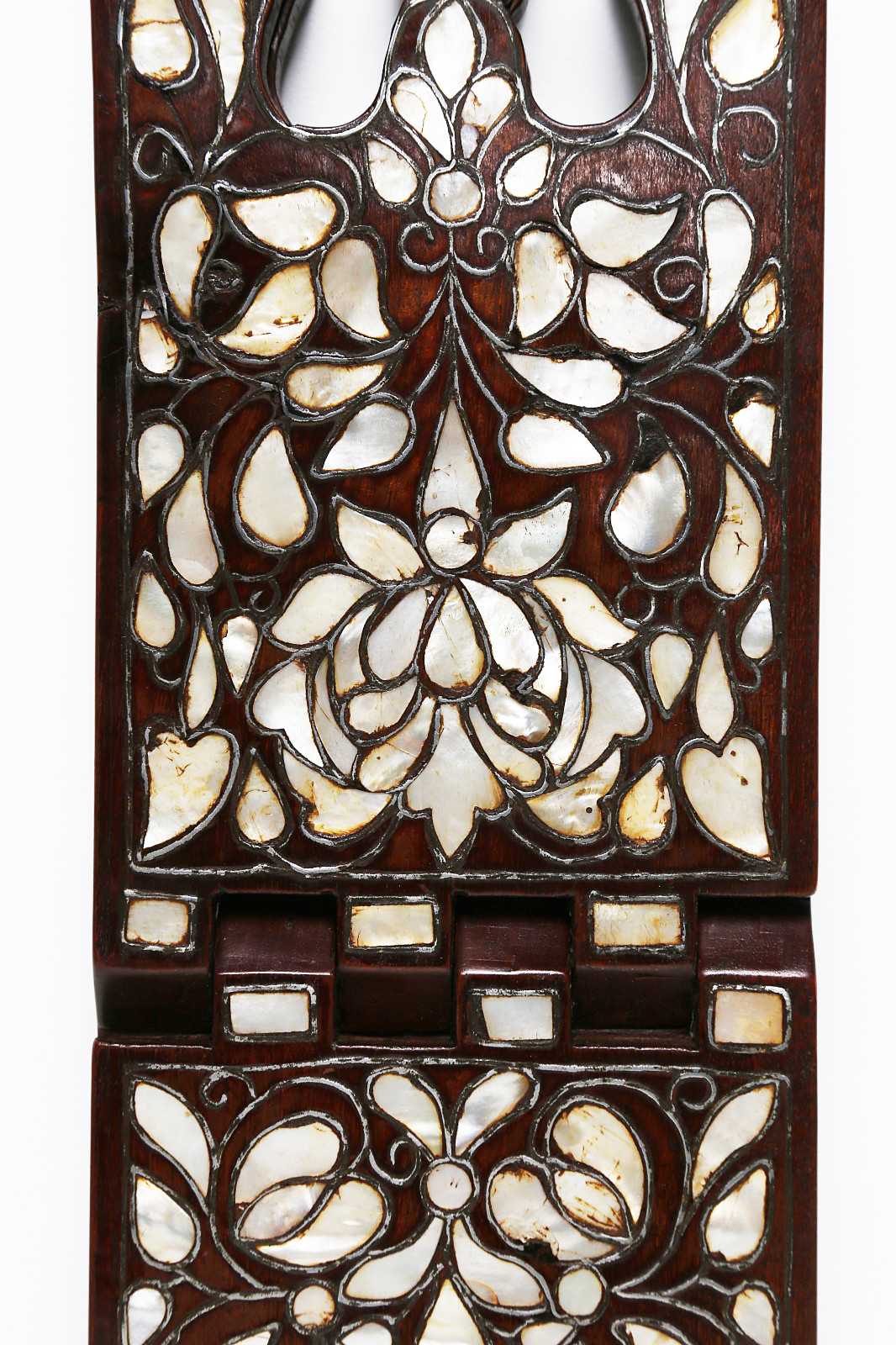 Arte Islamica Porta Corano in legno intarsiato con madreperla Vicino Oriente, fine XIX secolo. -. Cm 51,00 x 30,00. Reggi Corano pieghevole in legno fittamente intarsiato con la madreperla a formare elementi vegetali e palmette.
