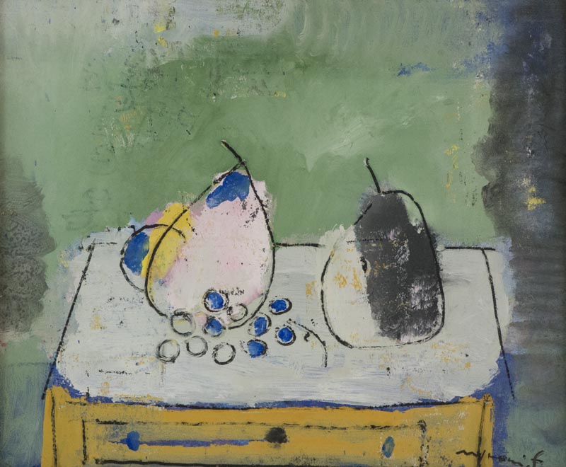 Franco Rognoni (Milano 1913 1999) Natura morta anni '70 Tecnica mista su carta intelata, cm. 45x55 Firmato in basso a destra. Sul verso: Timbri "Galleria d'Arte Lo Spazio", Brescia. Autentica della moglie Mariuccia Rognoni Noè su foto.