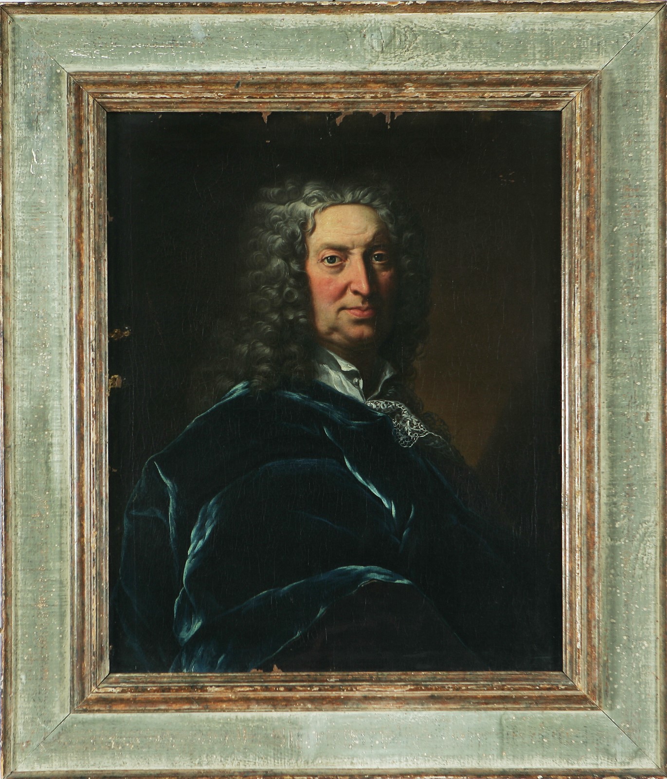 MAESTRO FRANCESE DEL XVIII SECOLO DELL'AMBIENTE DI RIGAUD Ritratto di gentiluomo con corpetto in velluto blu. Olio su tela. Cm 73,00 x 60,00.