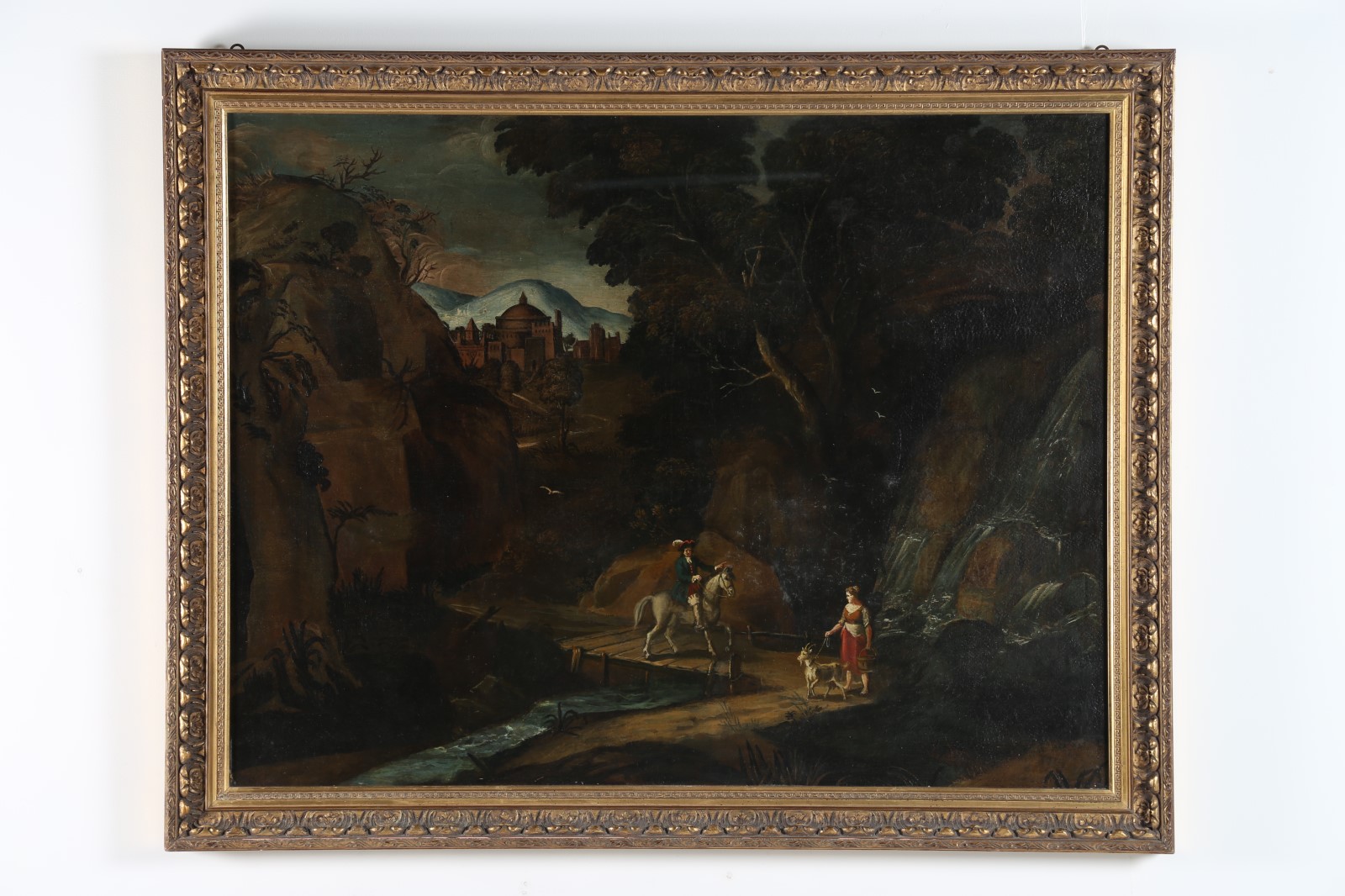 Lot 30 | ARTISTA DEL XVIII SECOLO Paesaggio con viandanti e città sullo sfondo. Olio...