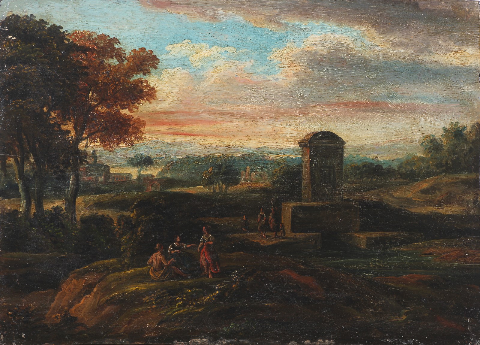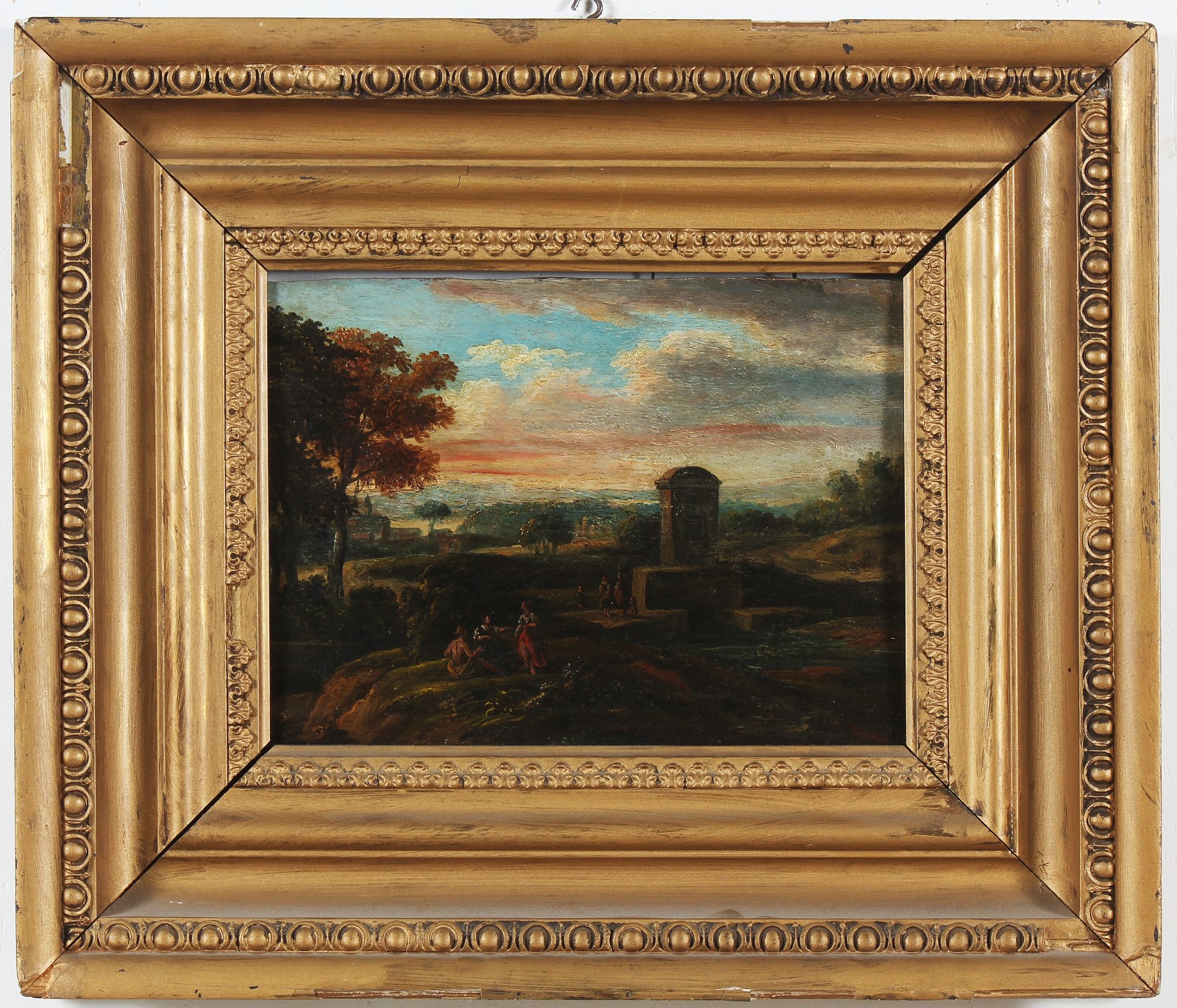 ARTISTA ROMANO DEL XVIII SECOLO Paesaggio e personaggi. Olio su tavola. Cm 34,00 x 24,00. ROMAN ARTIST XVIII CENTURY Landscape and characters. Oil on panel 34,00 x 24,00 cm. . Cornice presente