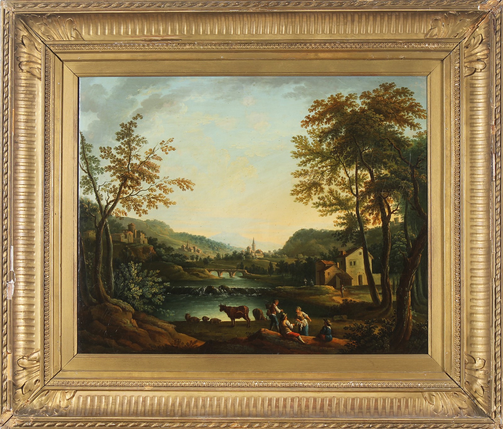 ARTISTA DELLA FINE DEL XVIII SEC. Paesaggio con personaggi. Olio su tela . Cm 73,00 x 60,00. XVIII CENTURY ARTIST Landscape with Characters. Oil on canvas 73,00 x 60,00 cm. . Cornice presente