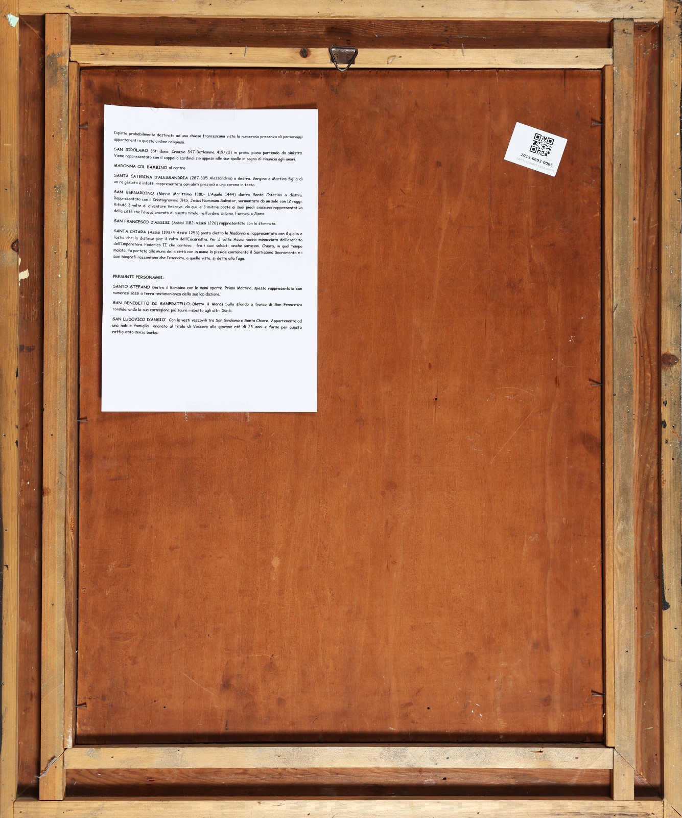 ARTISTA LOMBARDO DEL XVI SECOLO Madonna con Bambino e Vescovi che rinunciano al cardinalizio. Olio su tela applicata su tavola. Cm 51,50 x 66,00. . Cornice presente