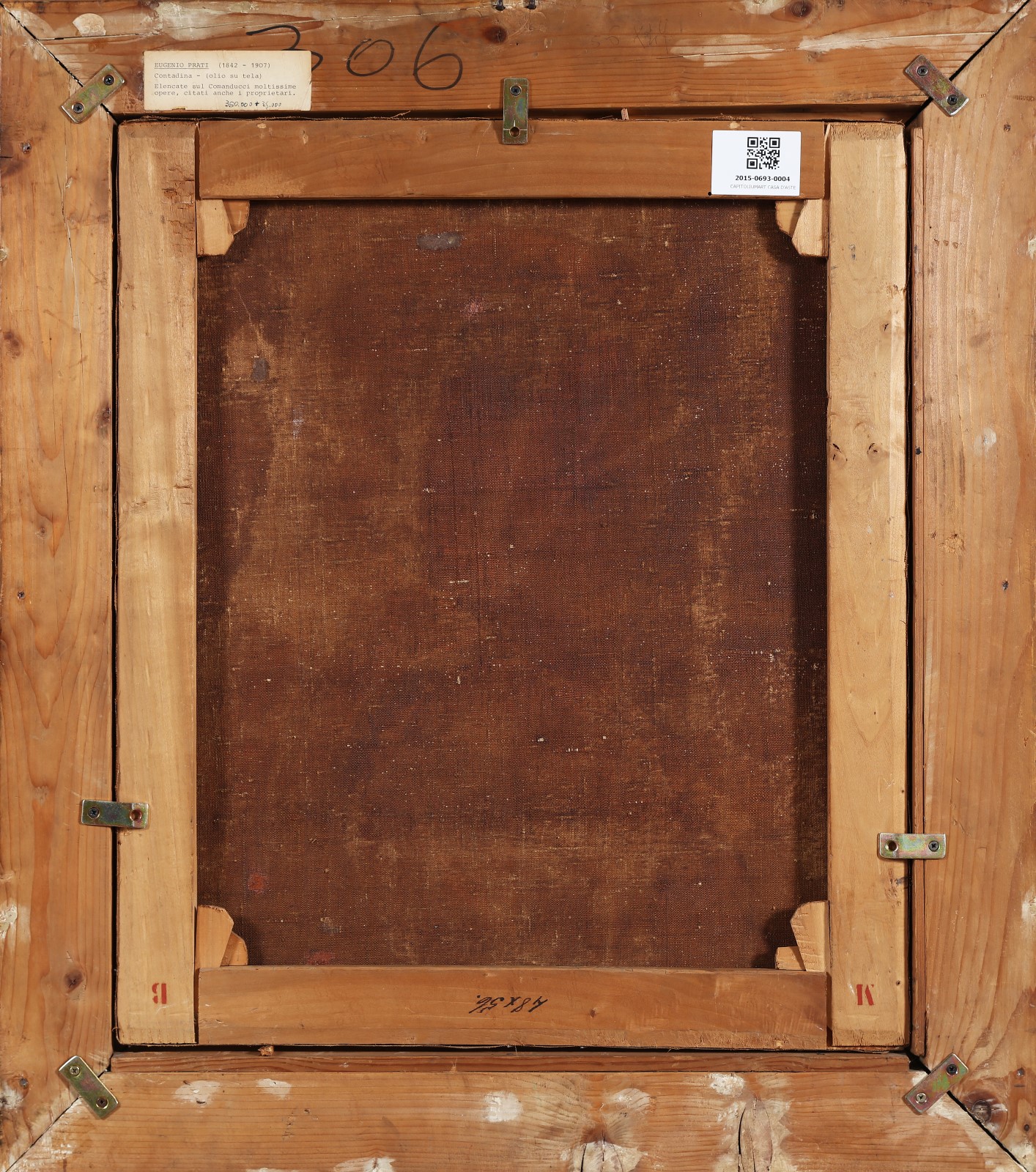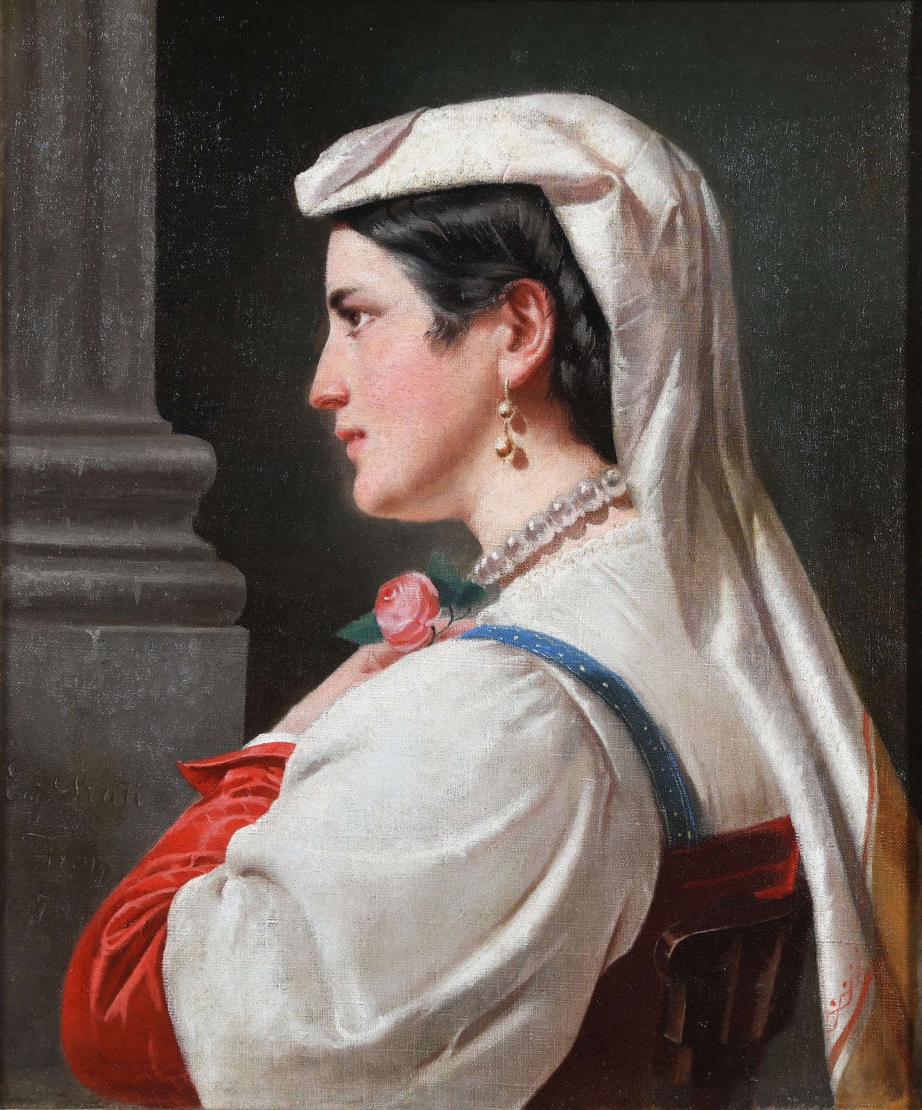 PRATI EUGENIO (1842 - 1907) Ritratto femminile di profilo. 1870. Olio su tela. Cm 48,00 x 56,00. Formato e datato in basso a sinistra. Cornice presente