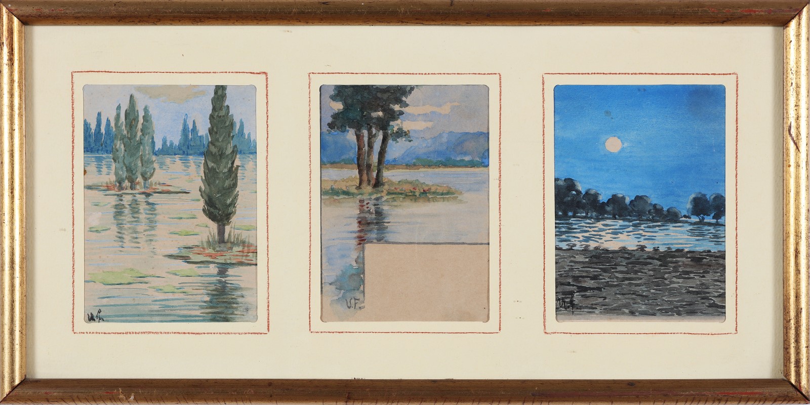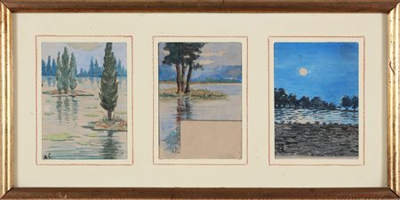 FRANCIOSI UMBERTO (1883 - 1917) Lotto composto da n. 3 acquerelli. Paesaggio. Acquerello su carta. Cm 9,50 x 12,00. Firma monogrammata. Cornice presente