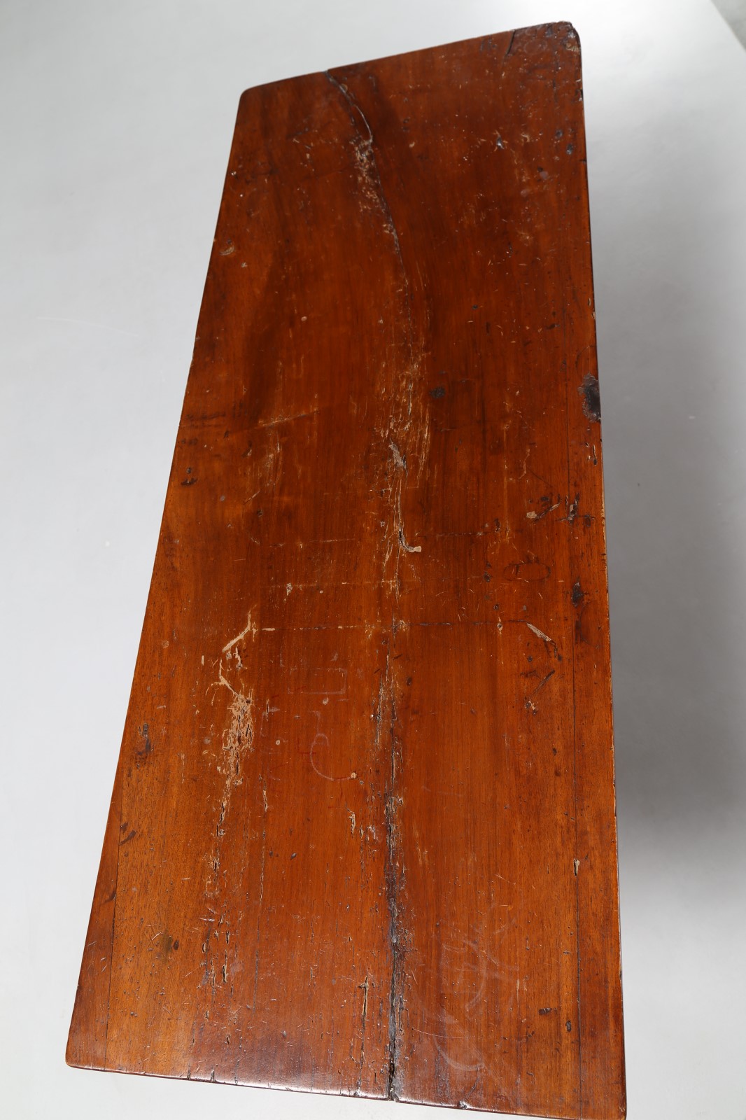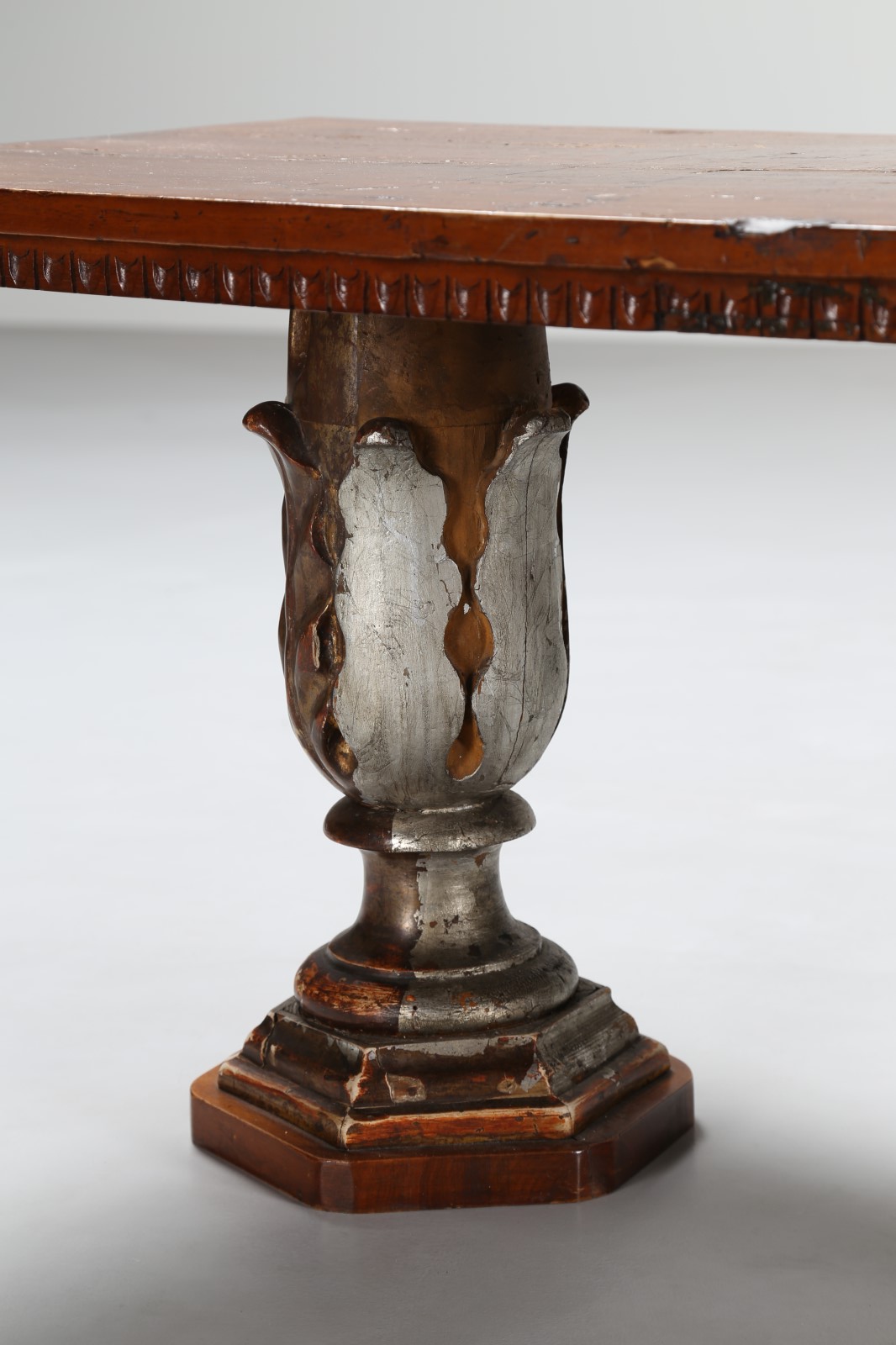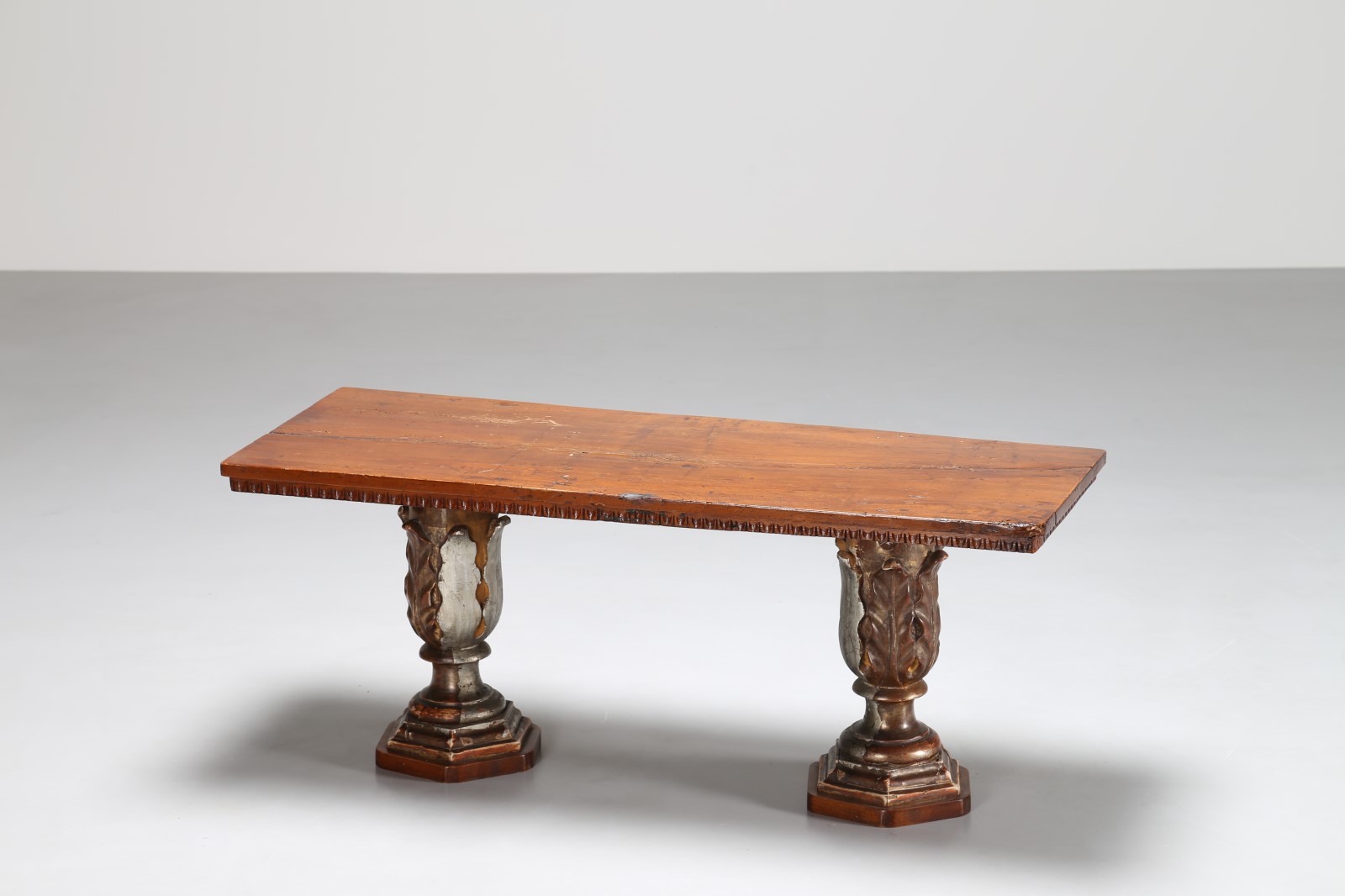 MANIFATTURA ITALIANA DEL XVIII SECOLO Tavolino a due gambe. Legno di noce. Cm 46,00 x 47,50 x 121,00. Restauri.
