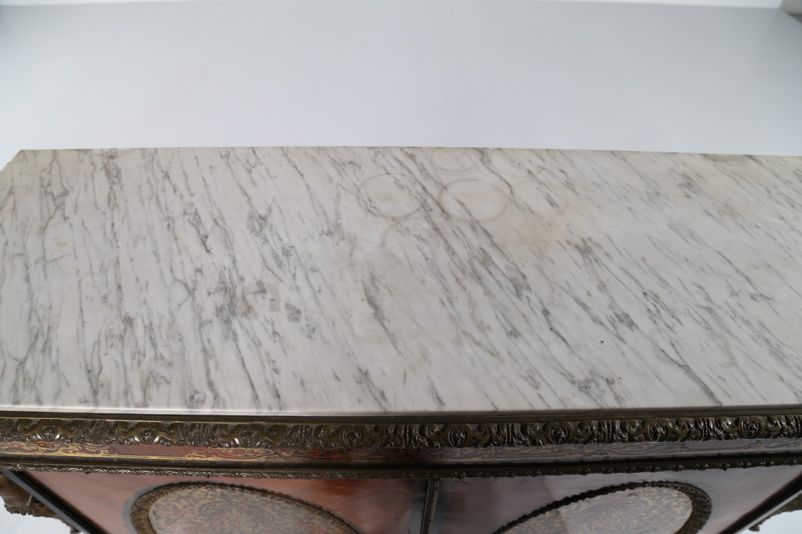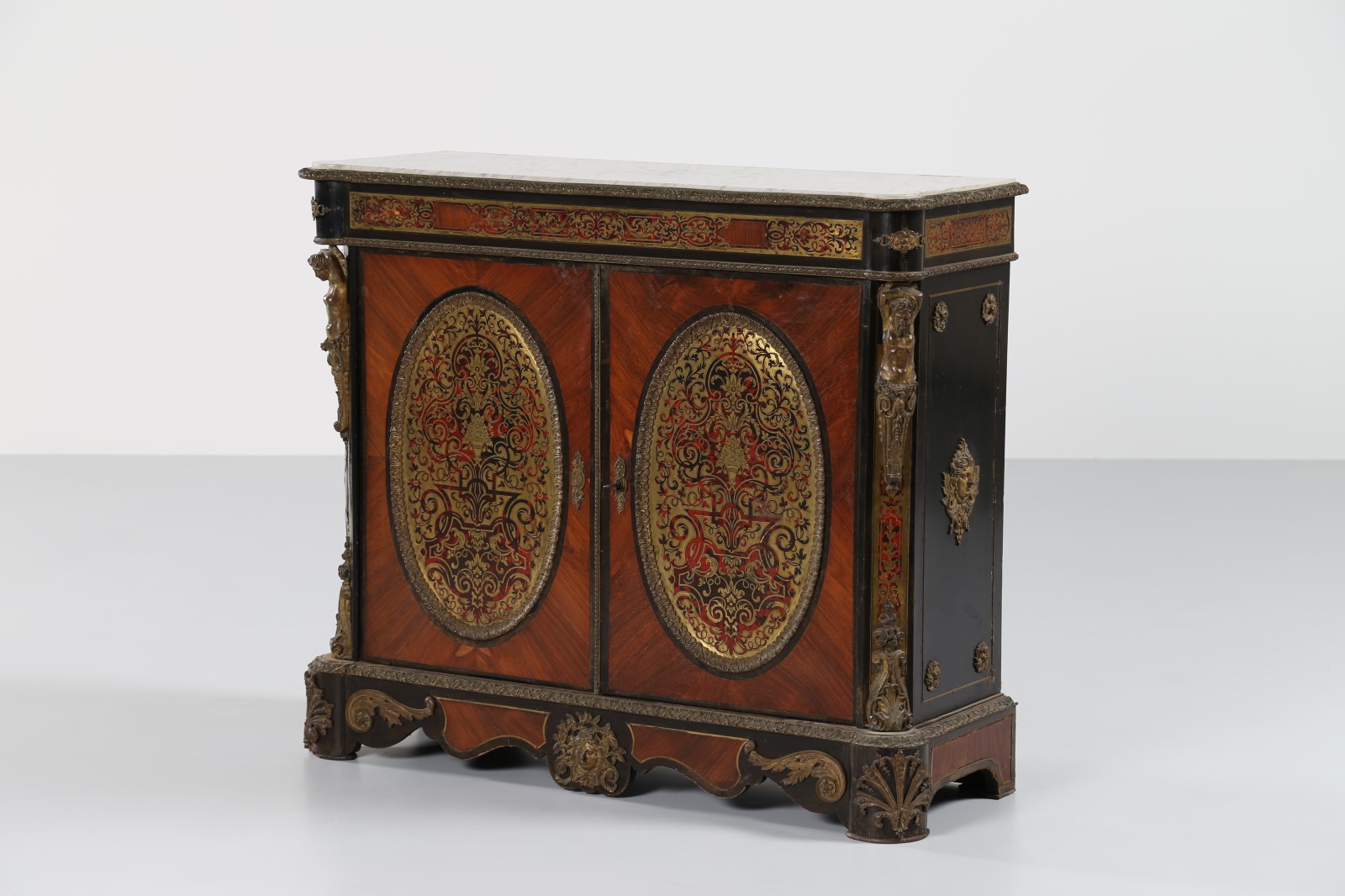 MANIFATTURA DEL XIX SECOLO Credenza in legno ebanizzato decorata con bronzi dorati in stile Boulle. Legno e marmo. Cm 103,00 x 118,00 x 42,00. Difetti.