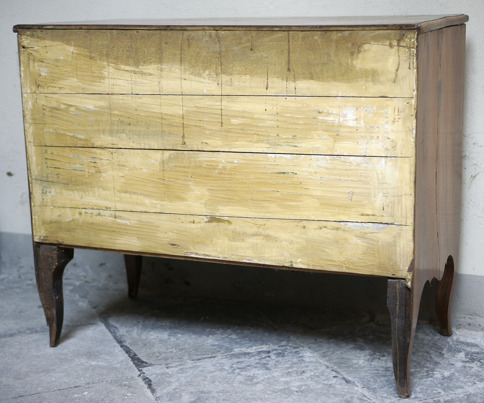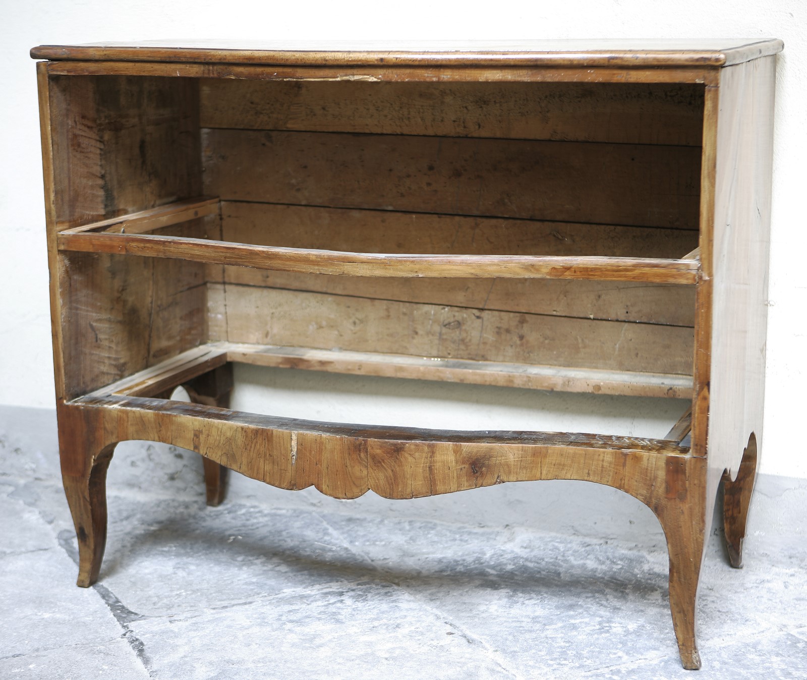 MANIFATTURA LOMBARDA DEL XVIII SECOLO Cassettone a due cassetti mosso sul fronte e lastronato in legno di noce. . Cm 85,00 x 55,00 x 65,00. Mosso sul fronte e radicato. Difetti.