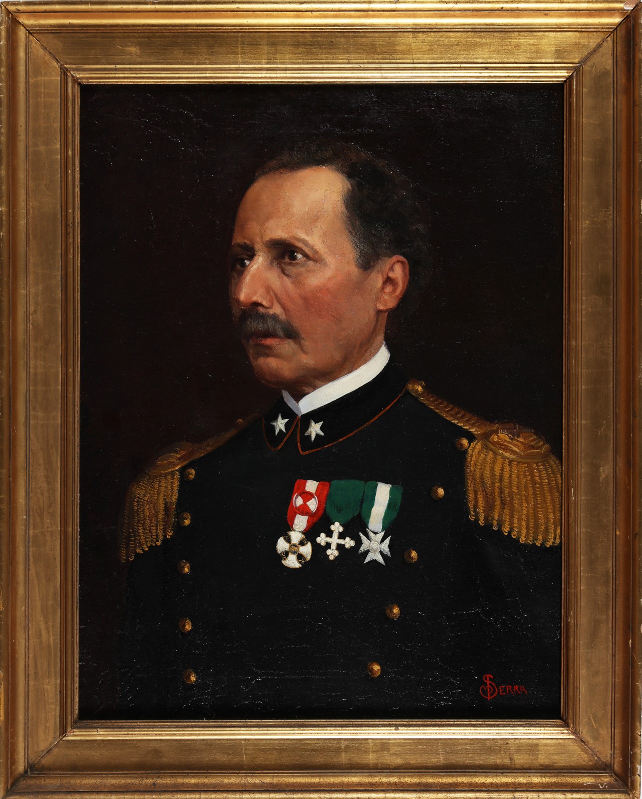 ARTISTA DELLA FINE DEL XIX SECOLO Ritratto di ufficiale. Olio su tela. Cm 50,00 x 65,00. Firmato Serra in basso a destra. Cornice presente