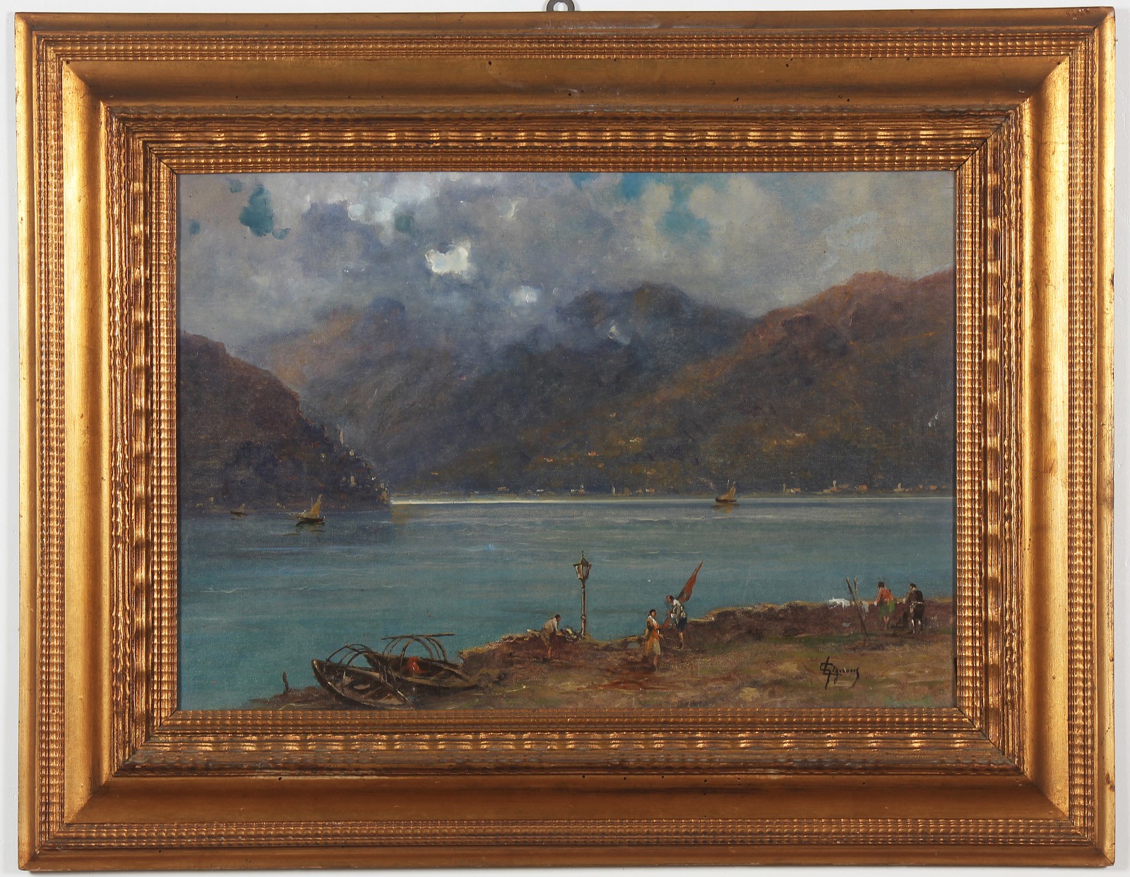 GIGNOUS LORENZO (1862 - 1958) Paesaggio lacustre. Olio su tela . Cm 65,00 x 50,00. Firma in basso a sinistra. Al retro cartiglio della Galleria Bolzani, Milano. Cornice presente