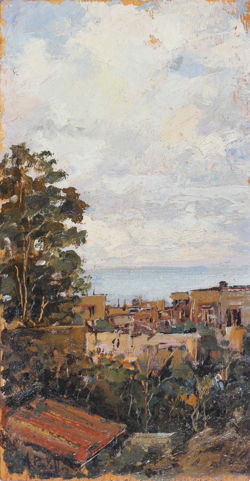 PRATELLA ATTILIO (1856 - 1949) Paesaggio. Olio su tavola. Cm 9,00 x 18,00. Firma in basso a sinistra. Cornice presente