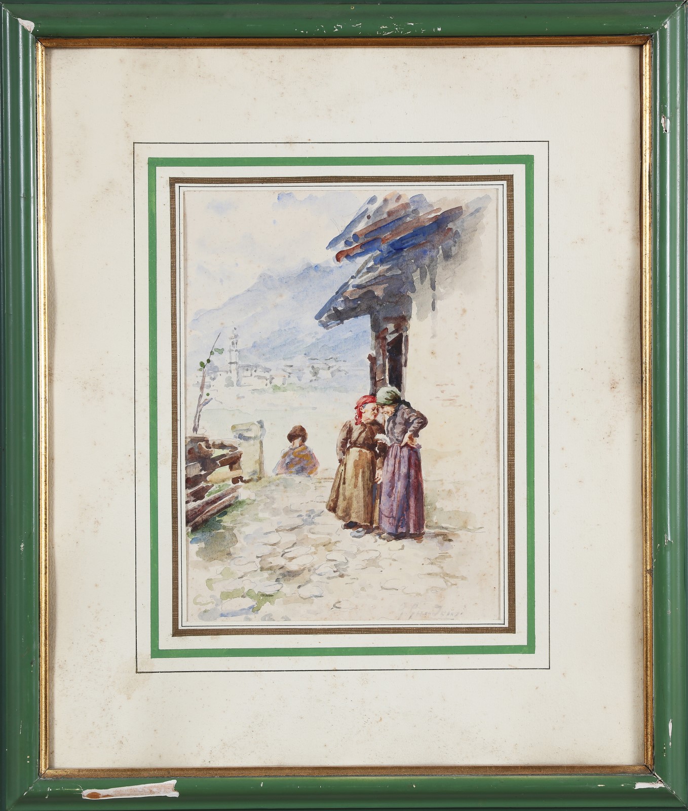 GAUDENZI GIUSEPPE (1865 - 1941) Vecchie di paese. Acquarello su carta. Cm 21,00 x 28,00. . Cornice presente