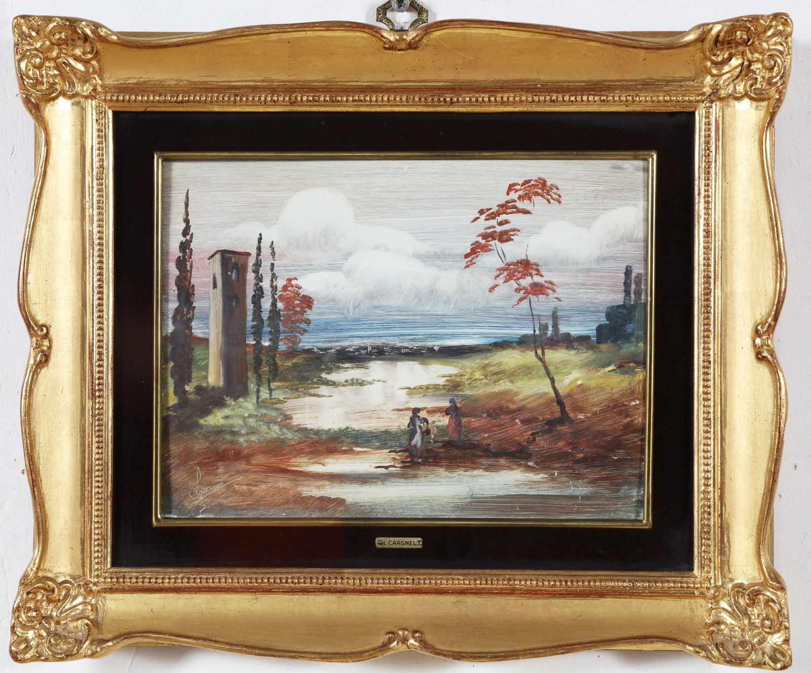 CARGNEL LUCIO (1903 - 1998) Paesaggio. Olio su cartone. Cm 24,00 x 18,00. Firma in basso a sinistra,. Cornice presente