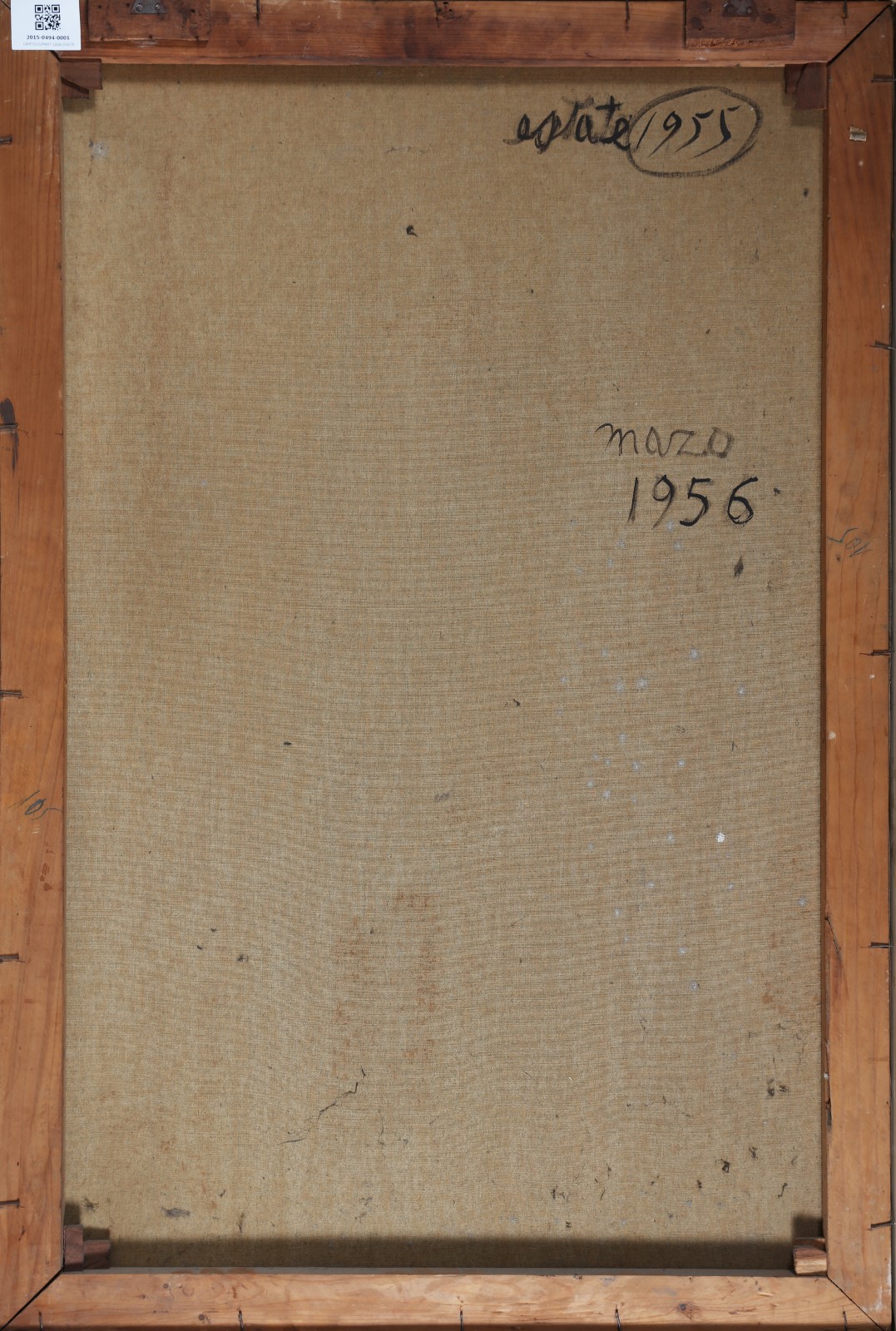 BASAGLIA VITTORIO (1936 - 2005) Tetti di Venezia. 1956. Olio su tela. Cm 70,00 x 110,00. Firma e anno in basso a destra. Al retro anno.