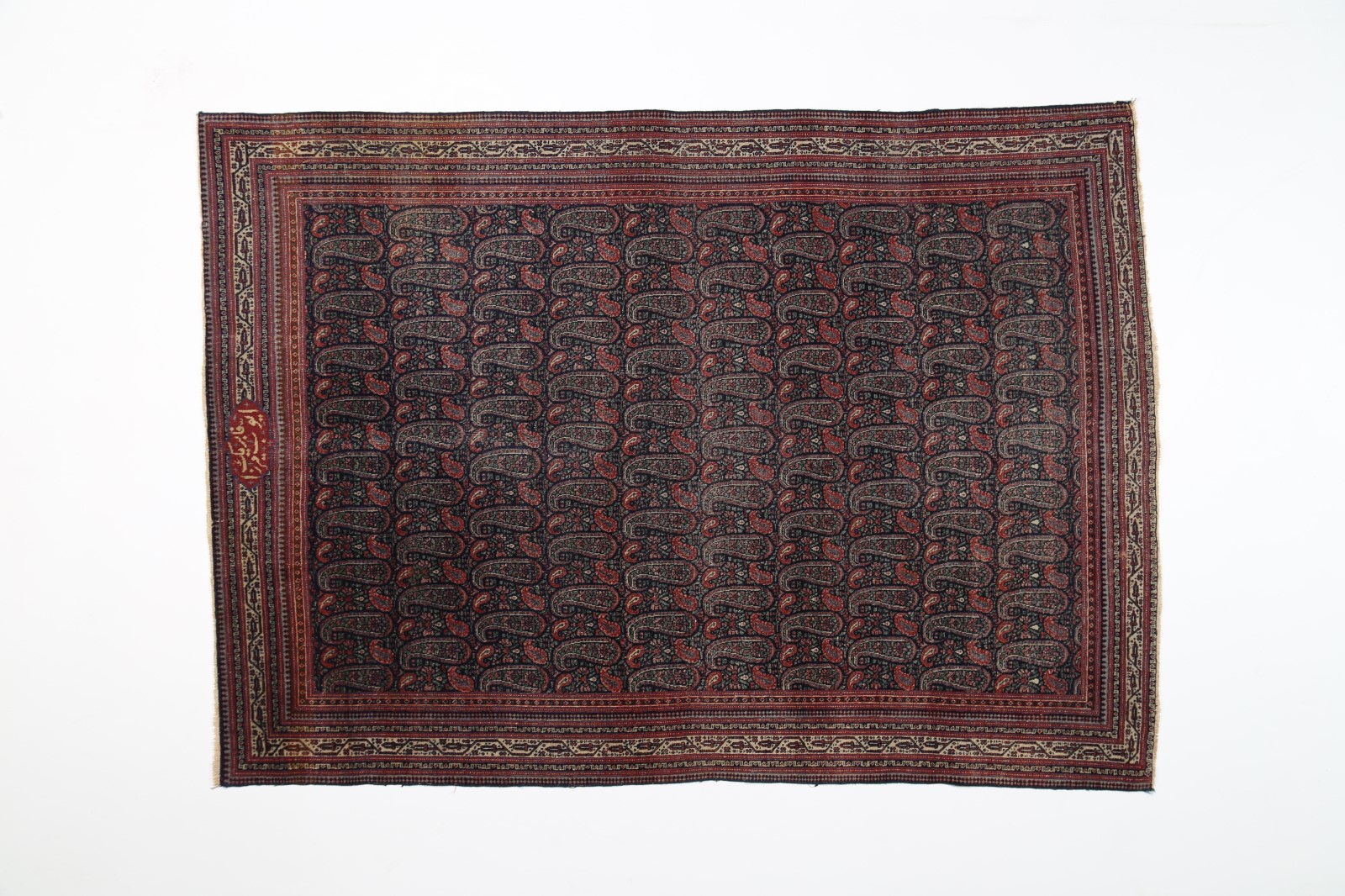 AGRA Tappeto orientale. India. 1880. Lana e cotone. Cm 136,00 x 188,00. Fondo blu, molti rombi. Ottimo stato di conservazione.