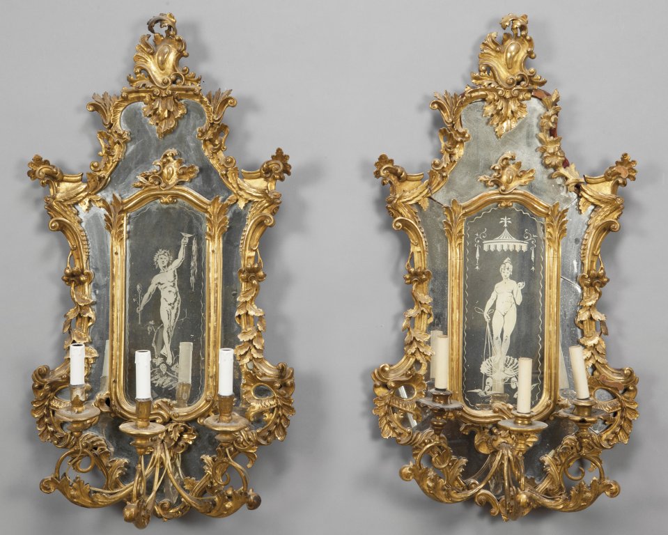 Lot 10 | Coppia di grandi apliques a tre luci in legno intagliato e dorato, Veneto...