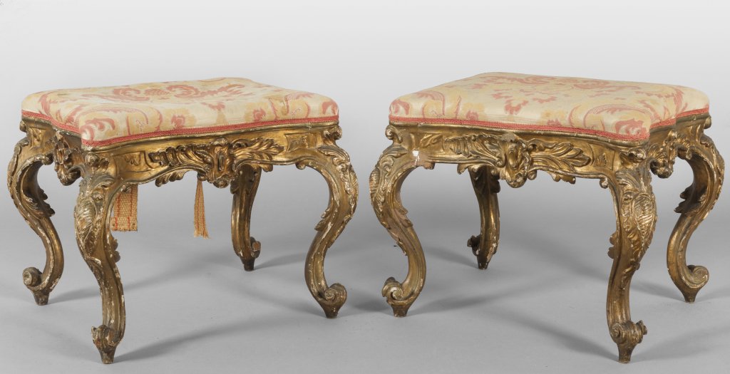 Coppia di panche ad un posto in legno finemente intagliato e dorato, Roma sec.XIX (difetti e mancanze)