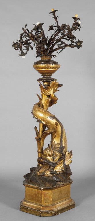Piantana in legno intagliato e dorato raffigurante un delfino reggitorciera, nella parte superiore porta luci in metallo, Genova sec. XIX