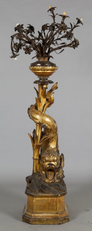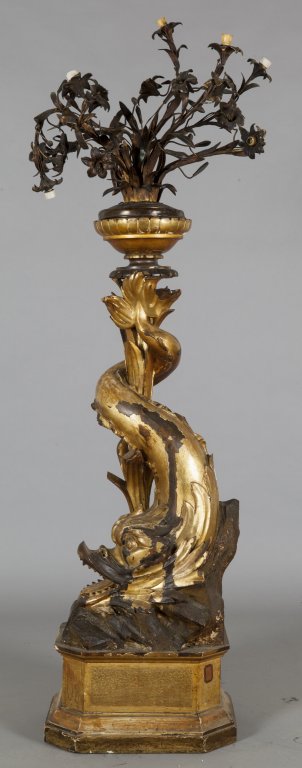 Piantana in legno intagliato e dorato raffigurante un delfino reggitorciera,...
