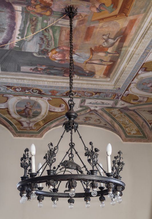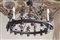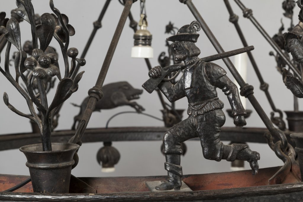 Lampadario a ruota in ferro battuto con figure di cacciatori, animali e piante