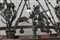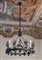 Lampadario a ruota in ferro battuto con figure di cacciatori, animali e...