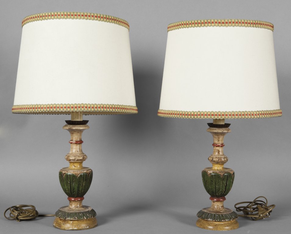 Coppia di piccoli vasetti in legno intagliato e laccato in policronia adattati a lampada