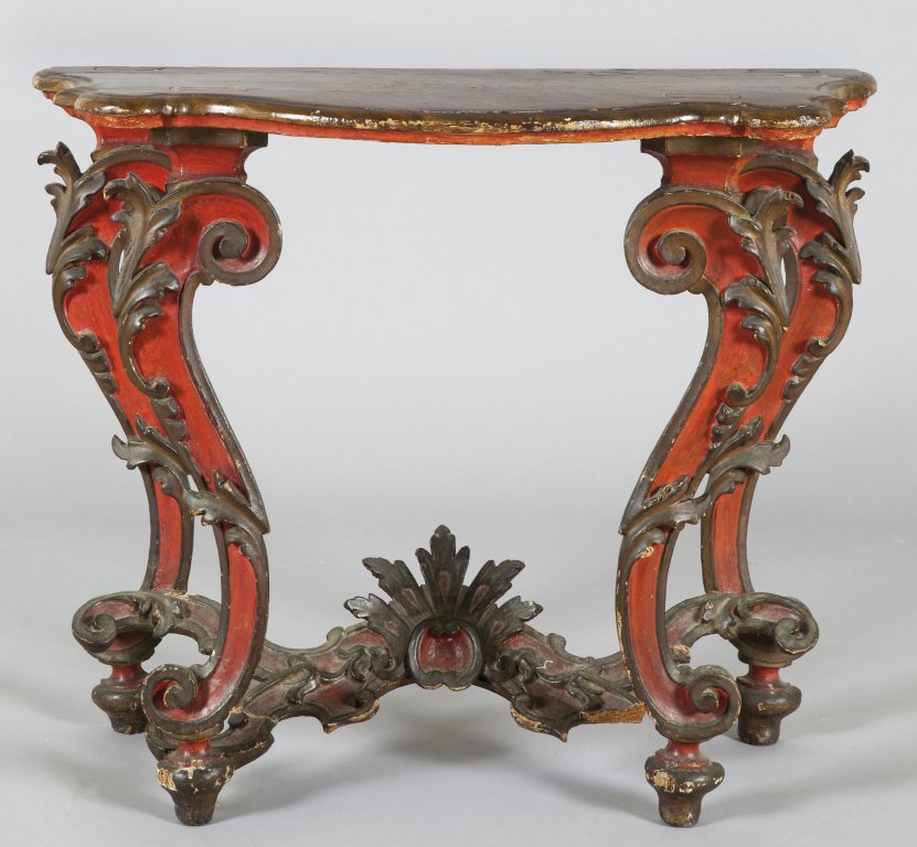 Piccola console in legno intagliato e lacca rossa ed oro, quattro gambe a volute, Lombardia sec. XVIII