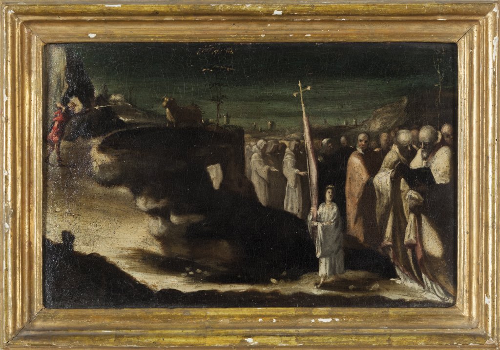 Scuola senese inizi sec.XVII "Apparizione di San Michele Arcangelo sul monte Gargano" olio